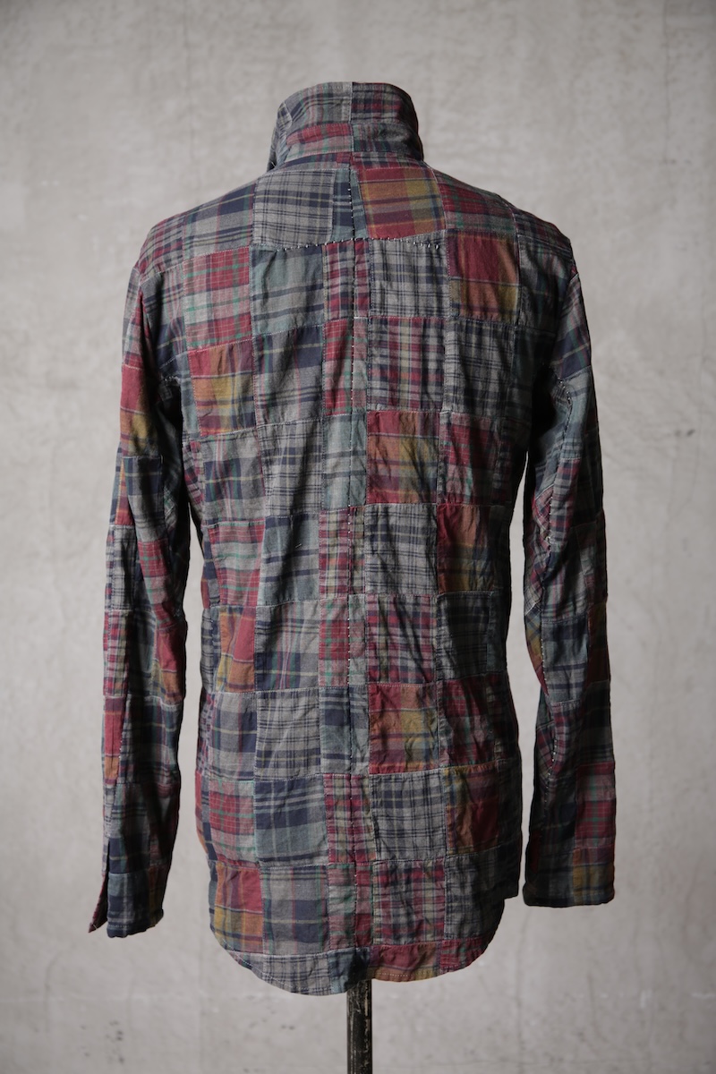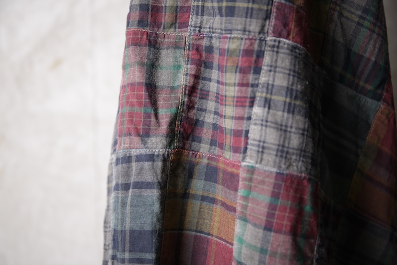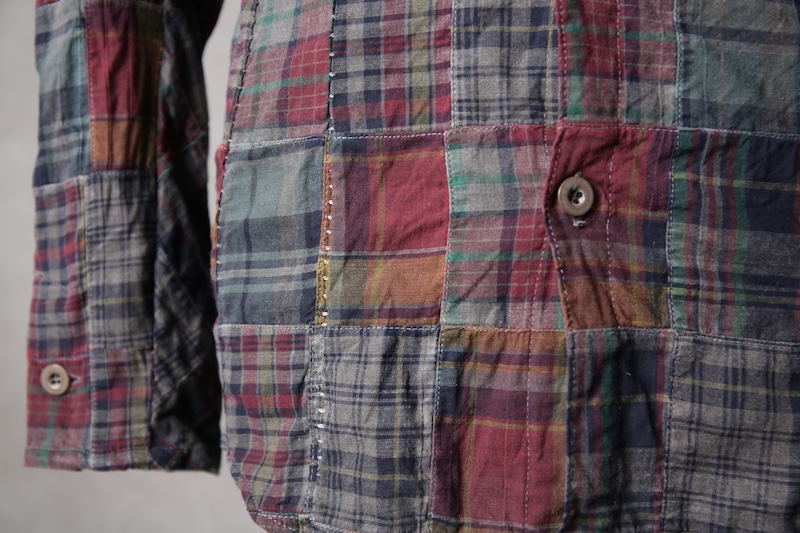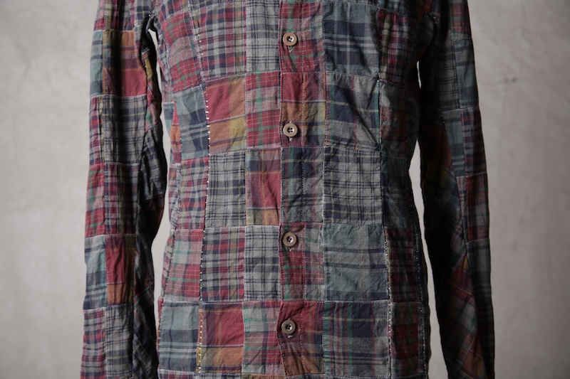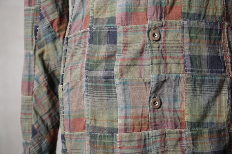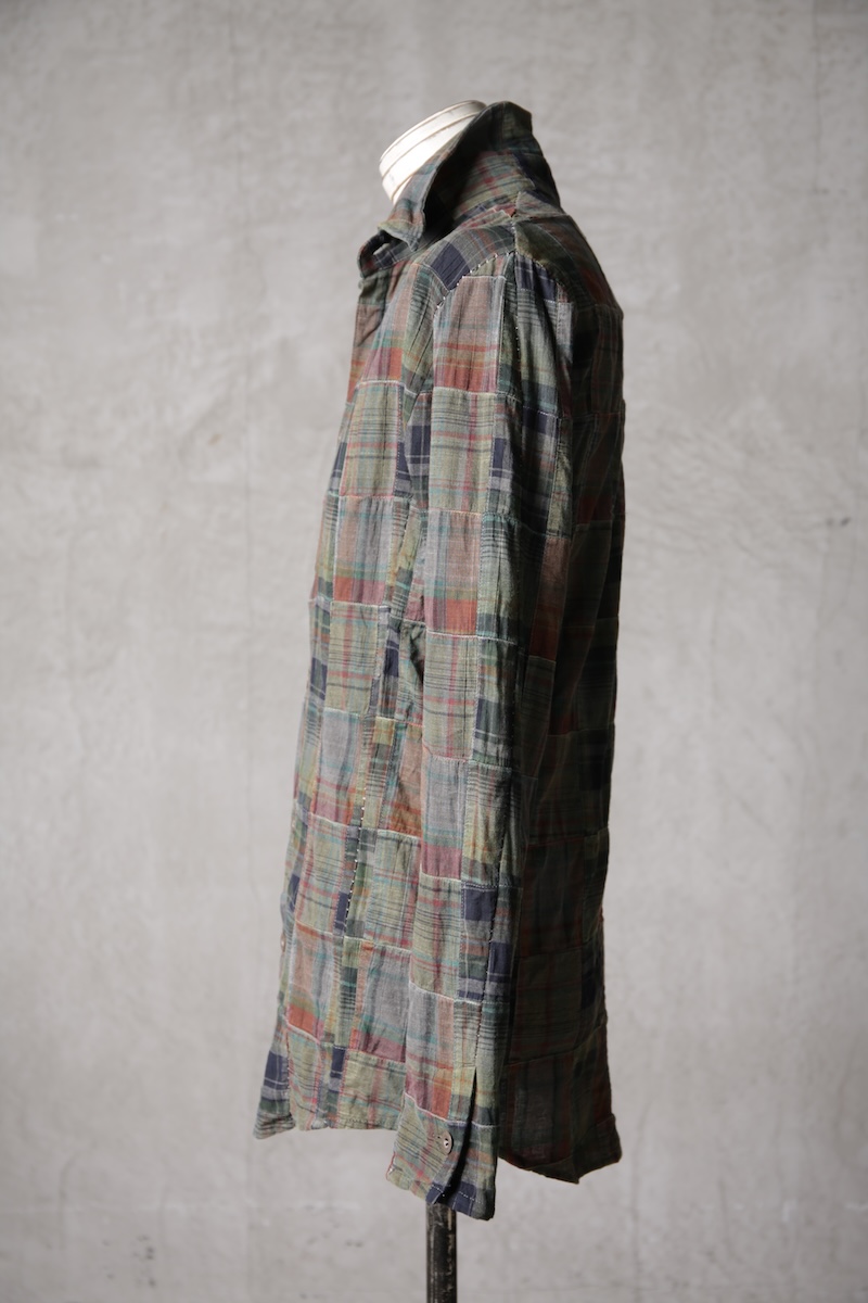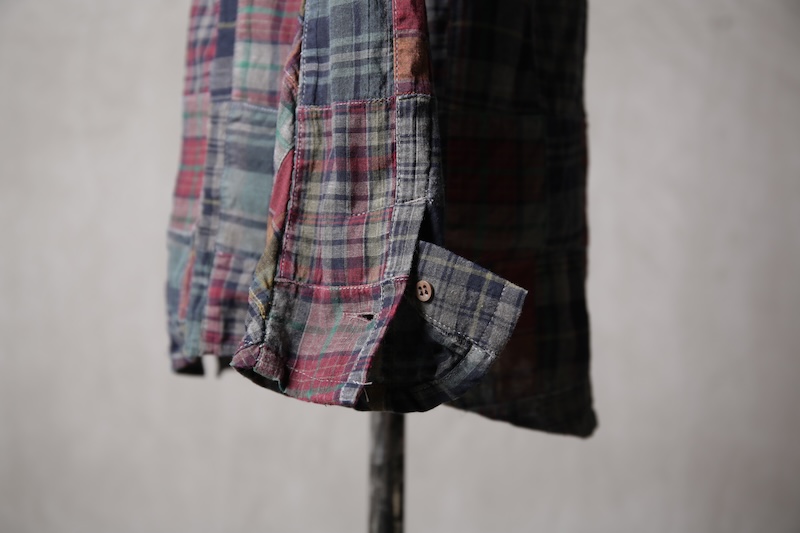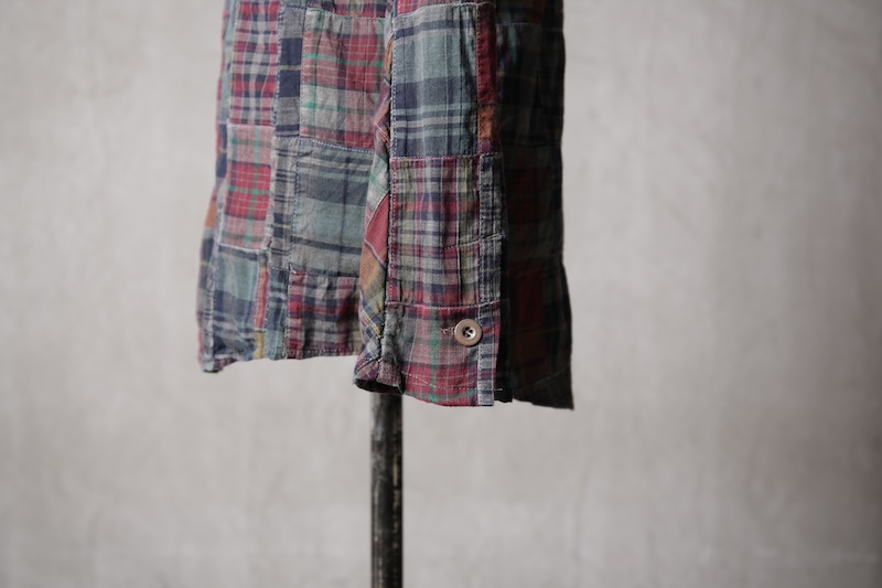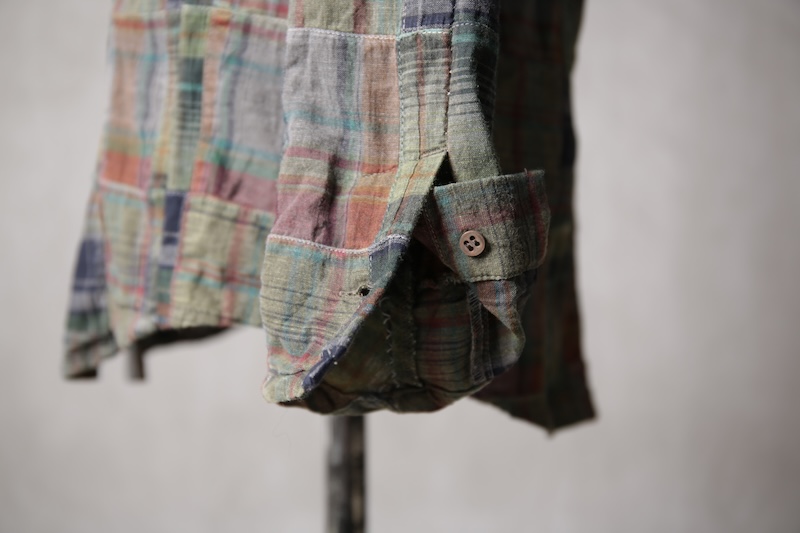 その意図を持って解体されたチェックのパッチワークとして紡ぎ合わせ、その上からさらに日本古来から存在する墨汁での染み込み染めを施したアイテム。