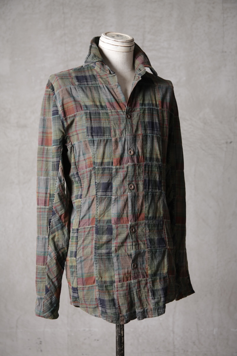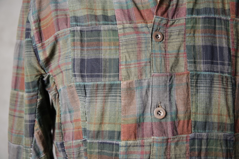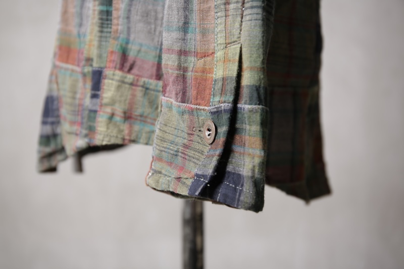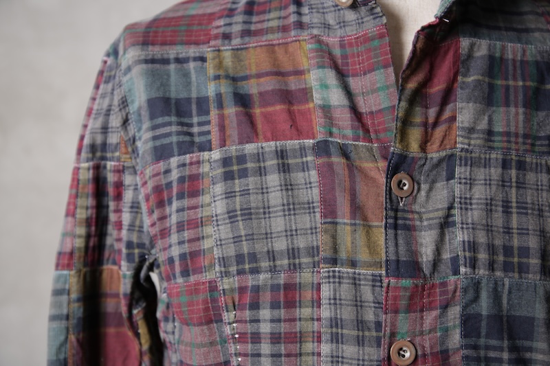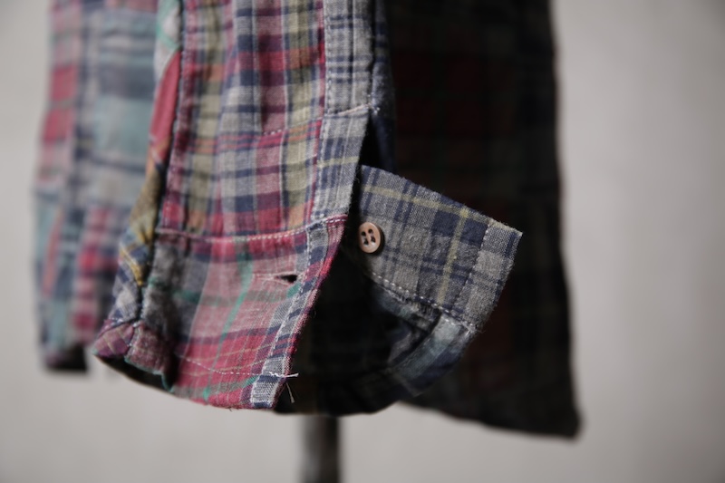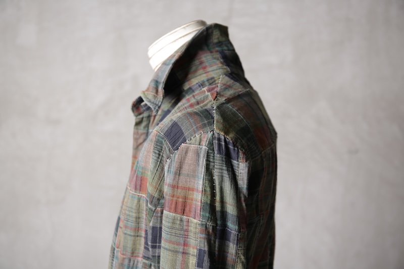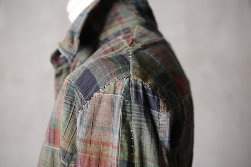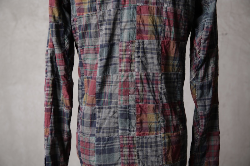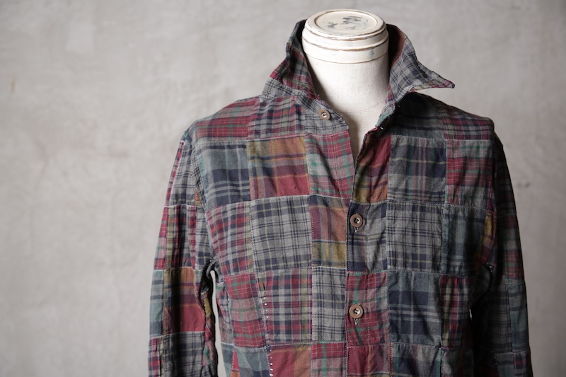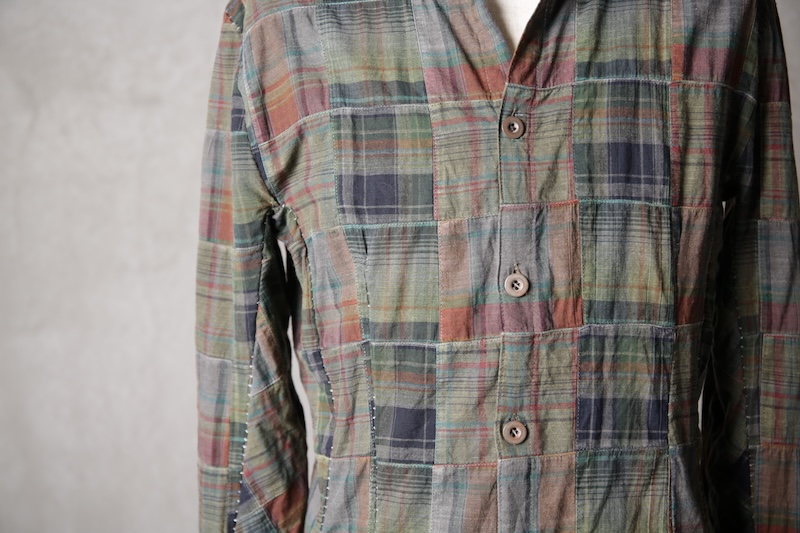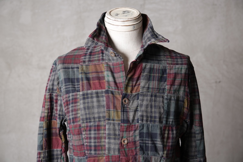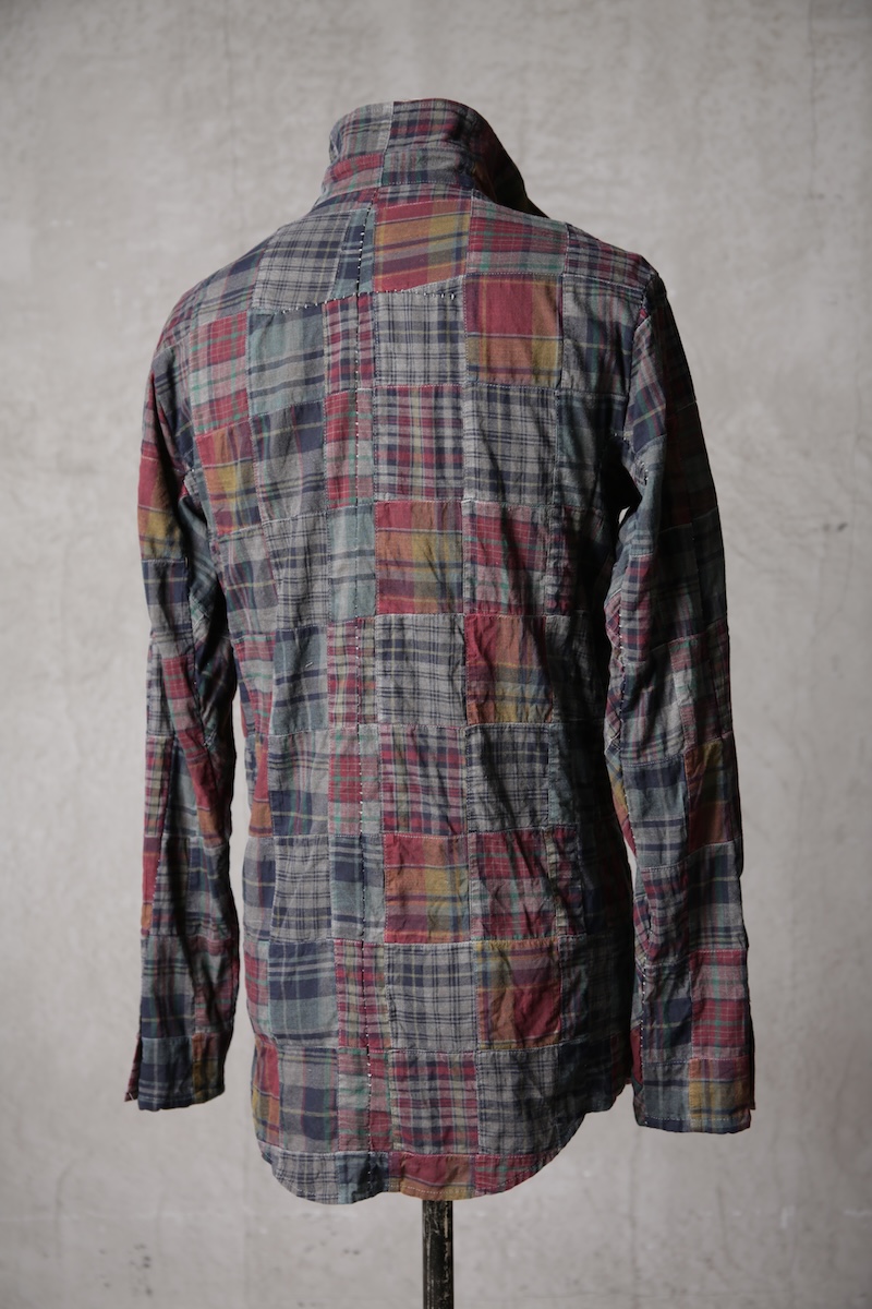 その意図を持って解体されたチェックのパッチワークとして紡ぎ合わせ、その上からさらに日本古来から存在する墨汁での染み込み染めを施したアイテム。