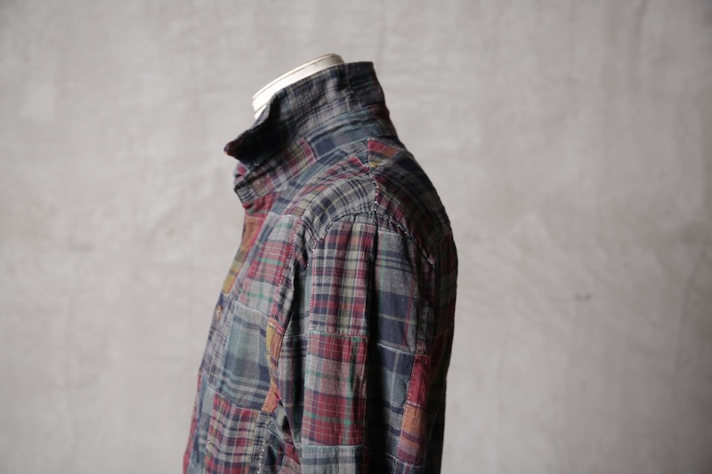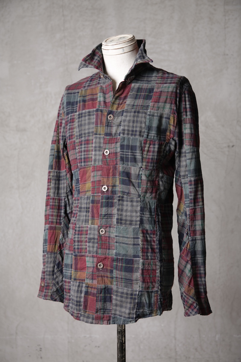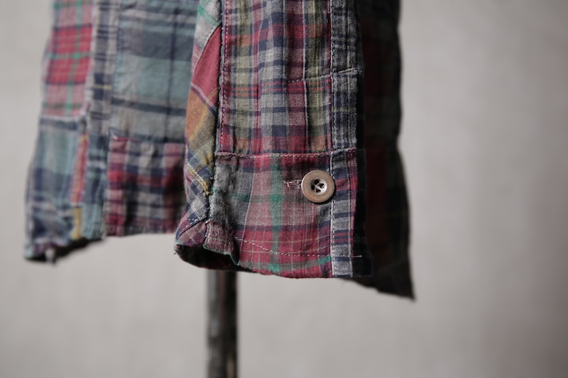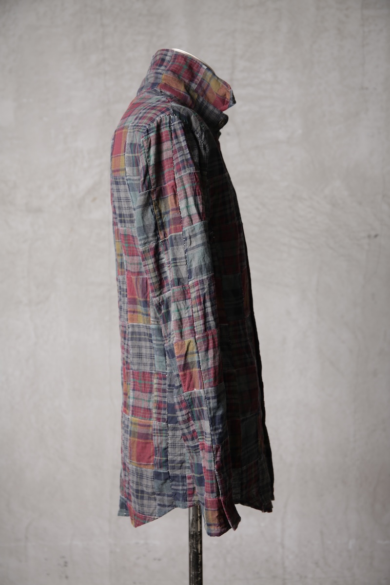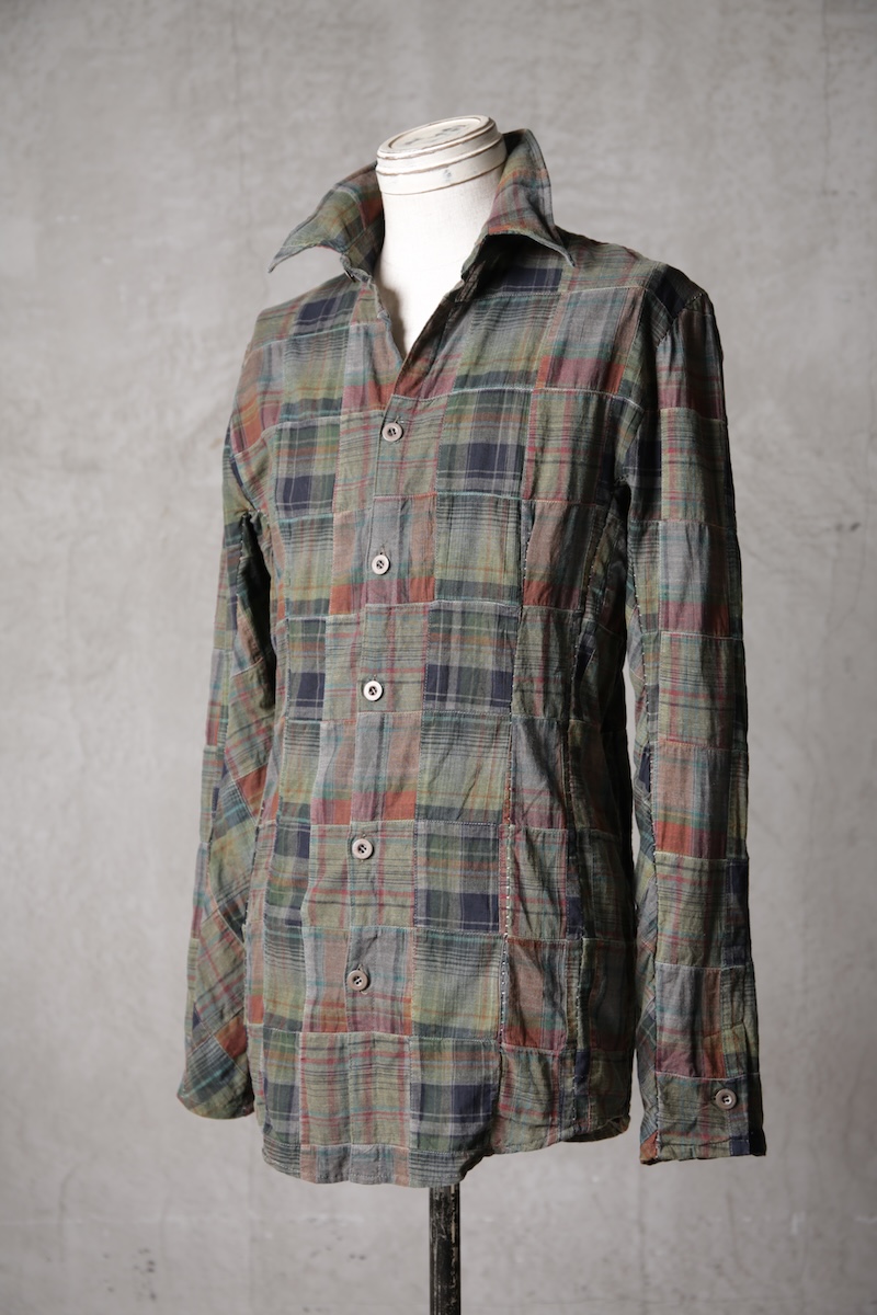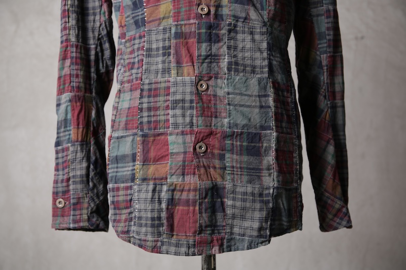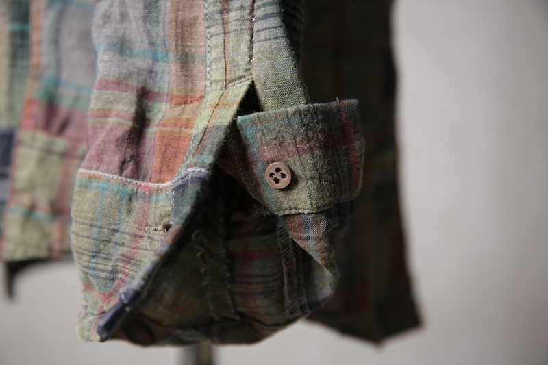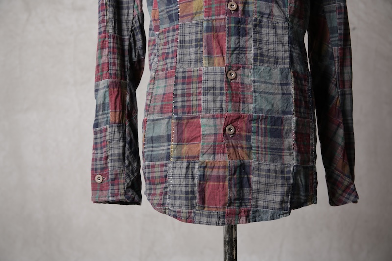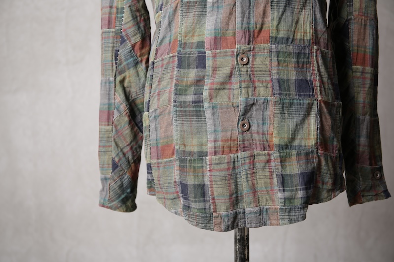 その意図を持って解体されたチェックのパッチワークとして紡ぎ合わせ、その上からさらに日本古来から存在する墨汁での染み込み染めを施したアイテム。
