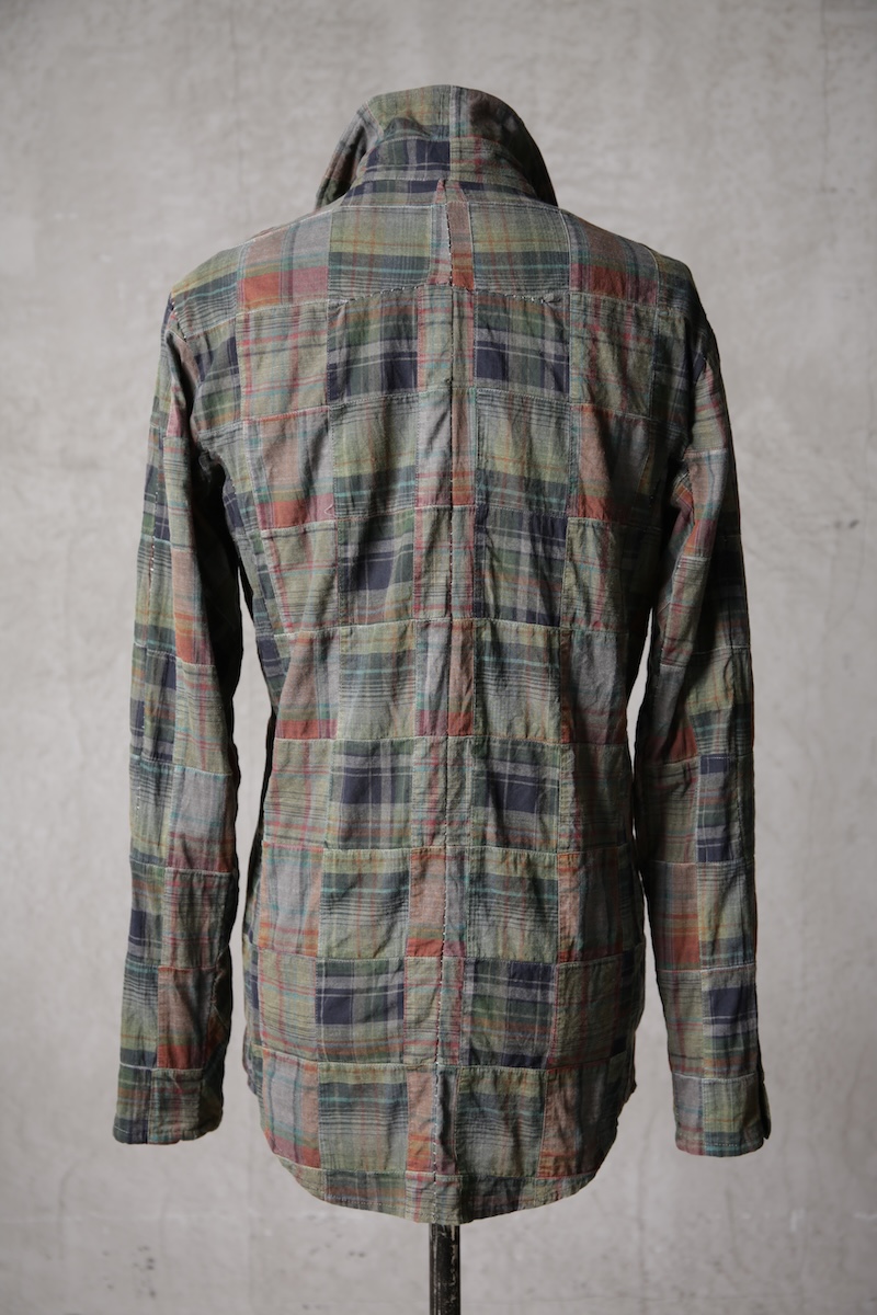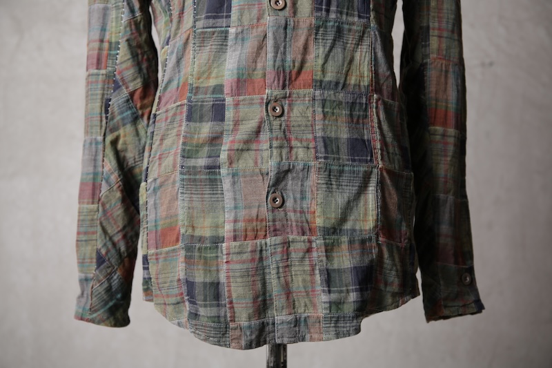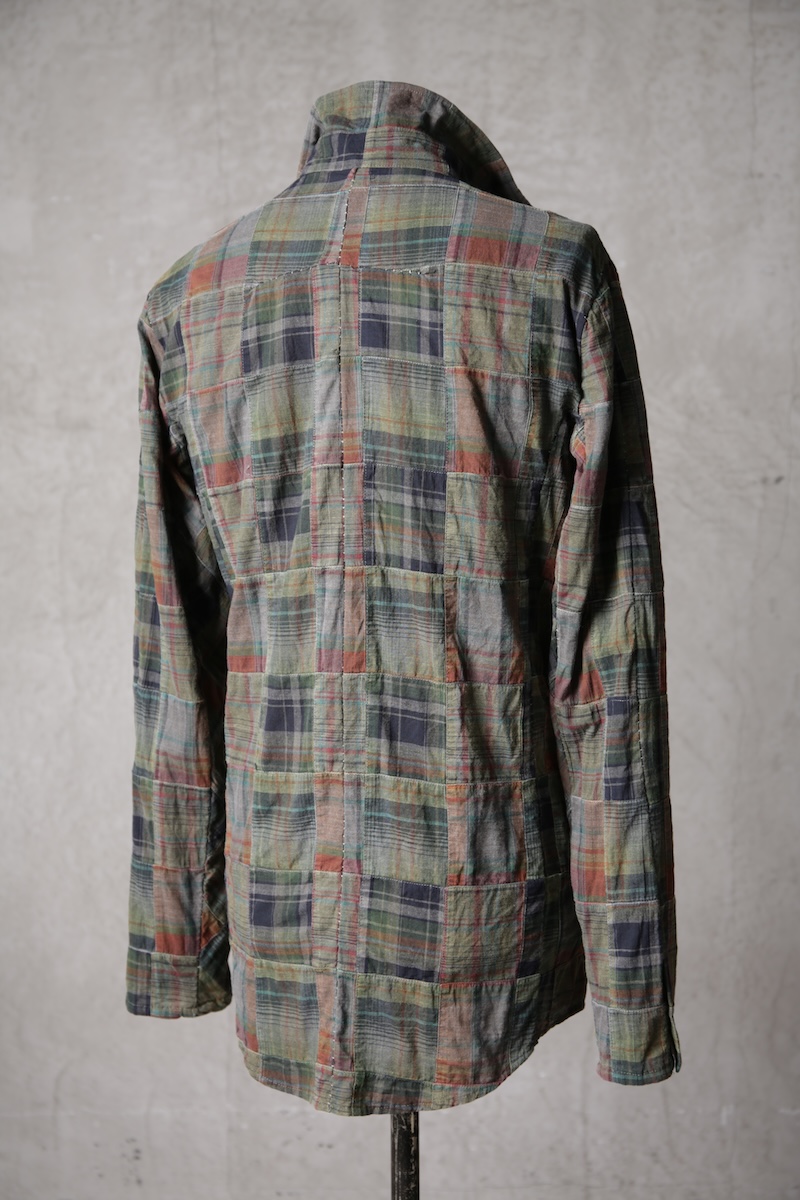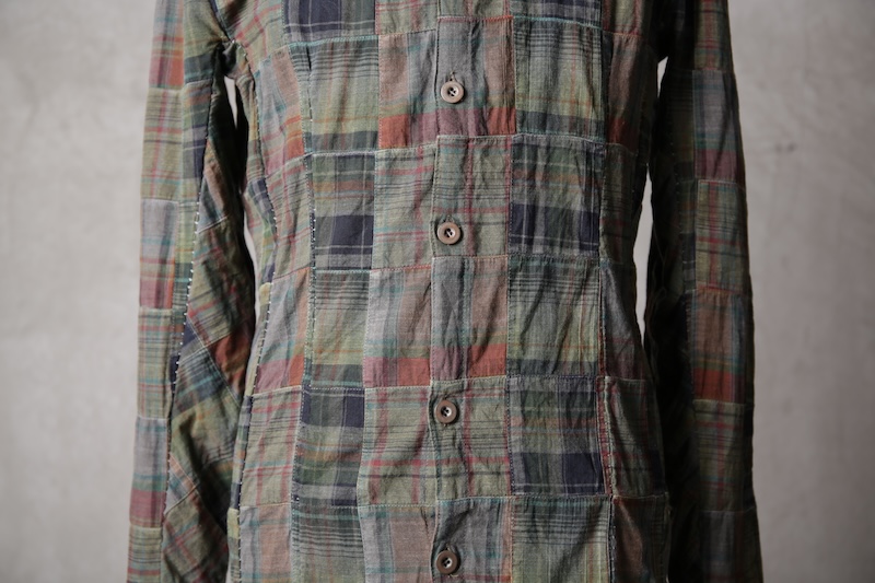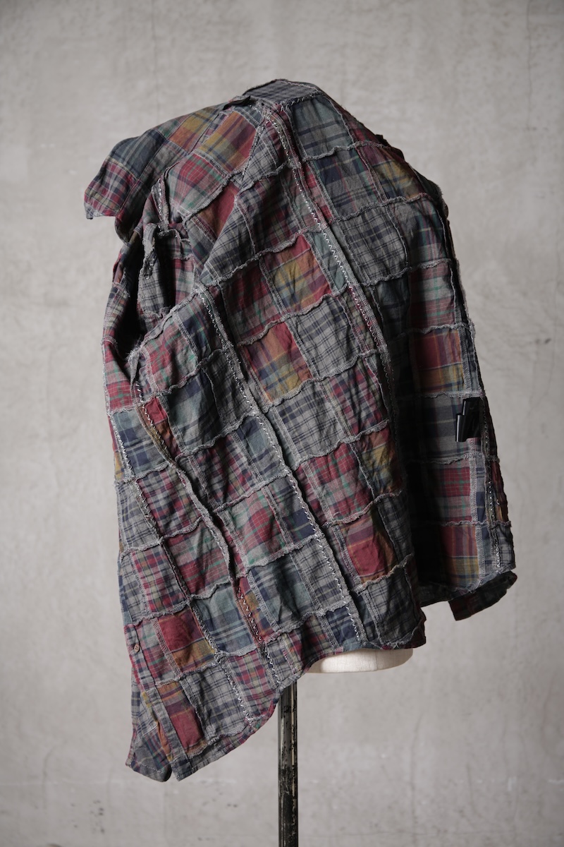 一度織り上げれたチェックの柄生地を意図的に新たに裁断し再縫製を施してパッチワーク状の1枚生地へと昇華させたうえで、日本古来から存在する墨汁で全体を染め上げた。洋が持つ文字の解釈を改めて解体し自分自身が生を受けたこの地での解釈へと置き換えて作り上げた。