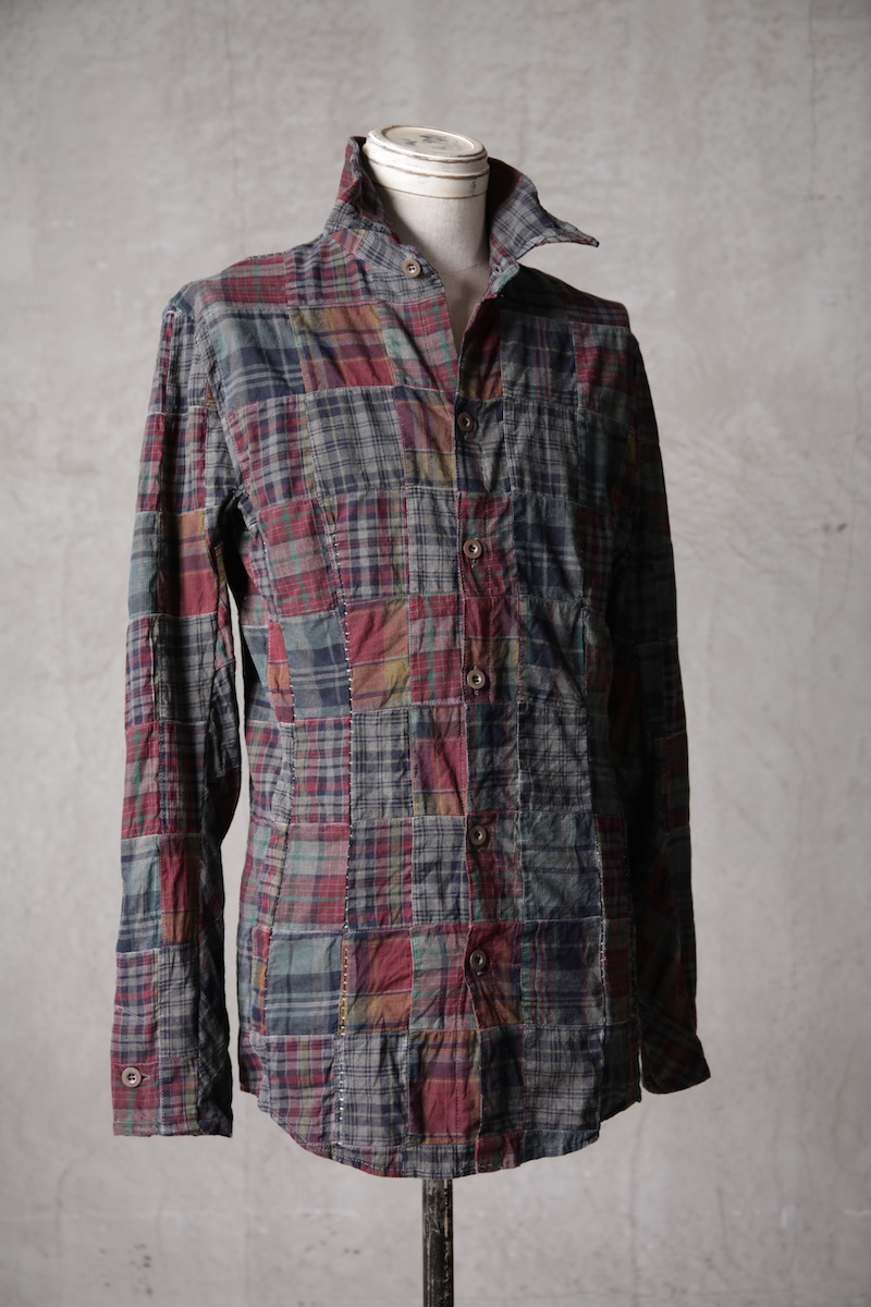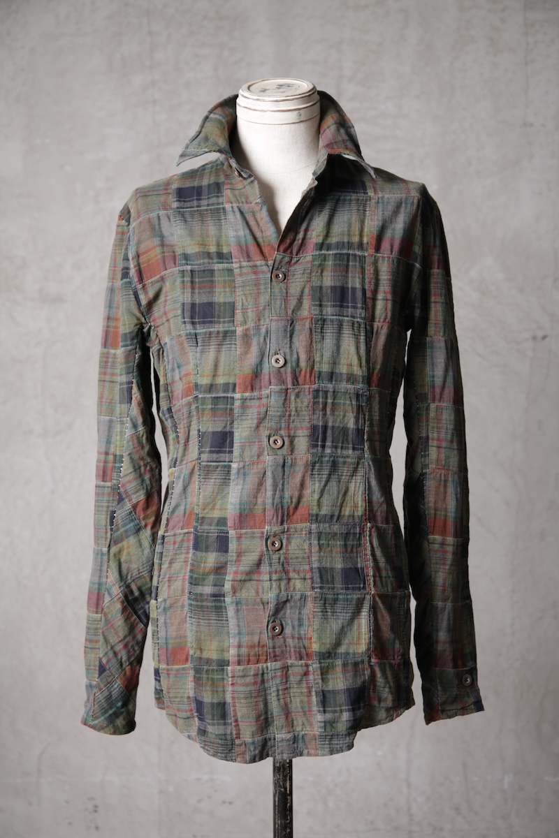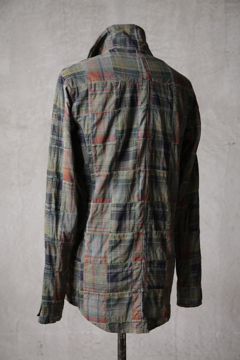 一度織り上げれたチェックの柄生地を意図的に新たに裁断し再縫製を施してパッチワーク状の1枚生地へと昇華させたうえで、日本古来から存在する墨汁で全体を染め上げた。洋が持つ文字の解釈を改めて解体し自分自身が生を受けたこの地での解釈へと置き換えて作り上げた。