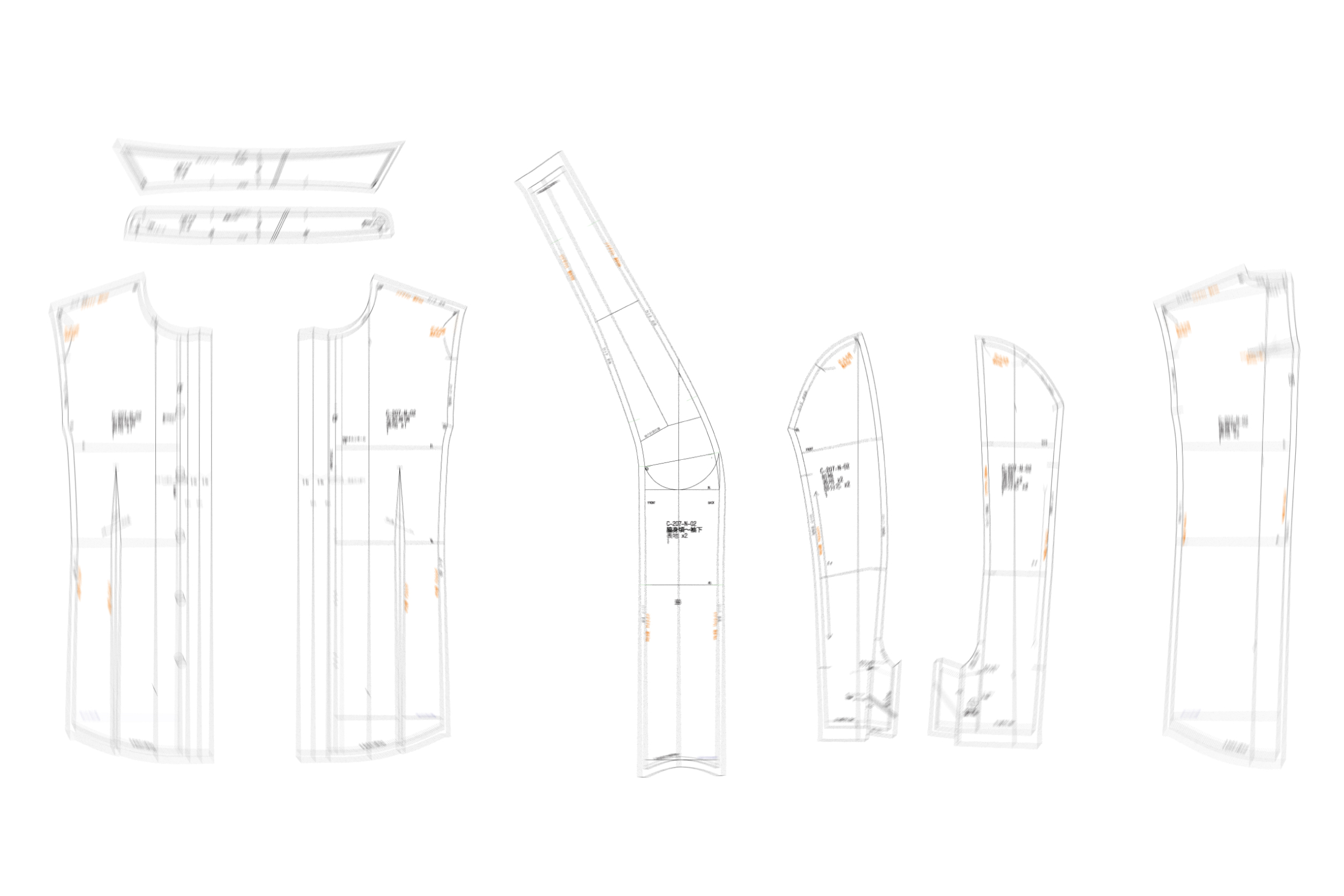 マテリアルの主張とそれに呼応する美しい縦長のフォルムを持ったシャツのパターンニングがまさしく「完成された作品」であると言える。