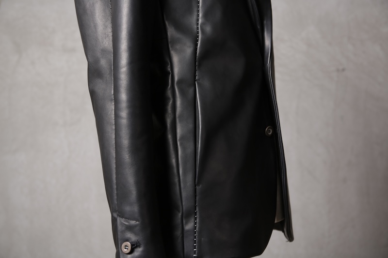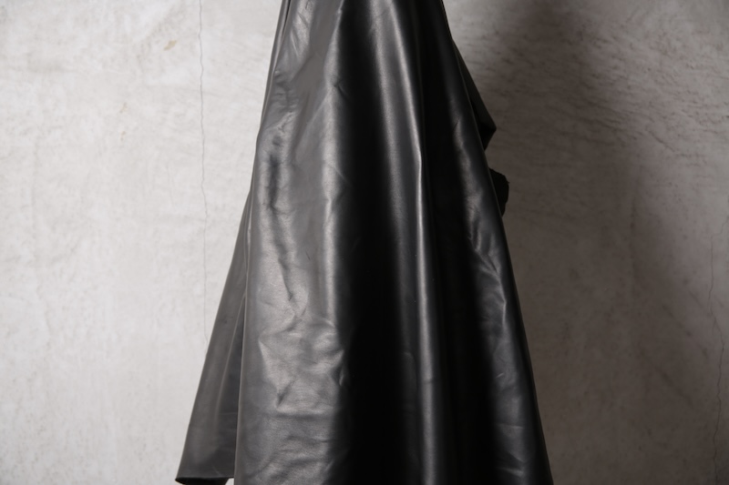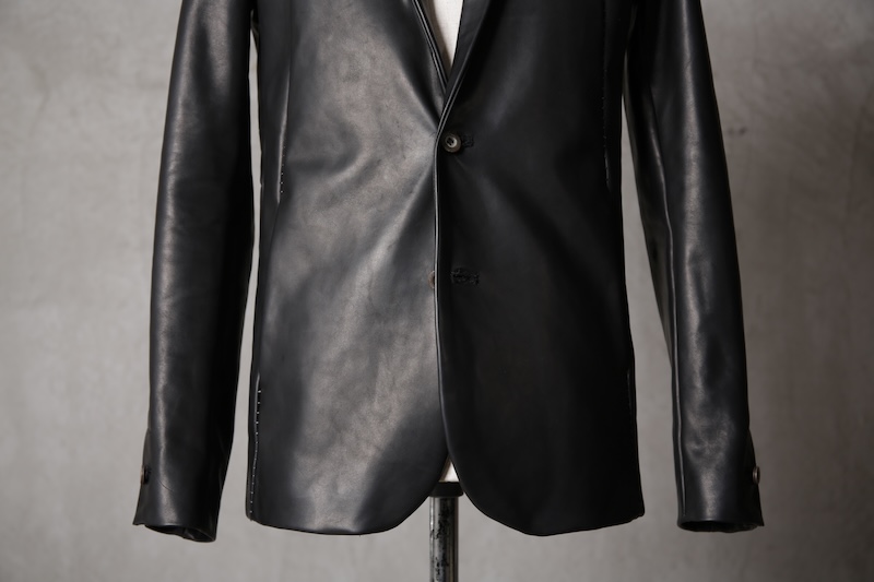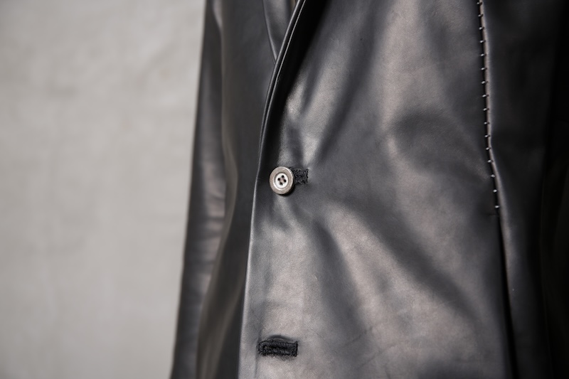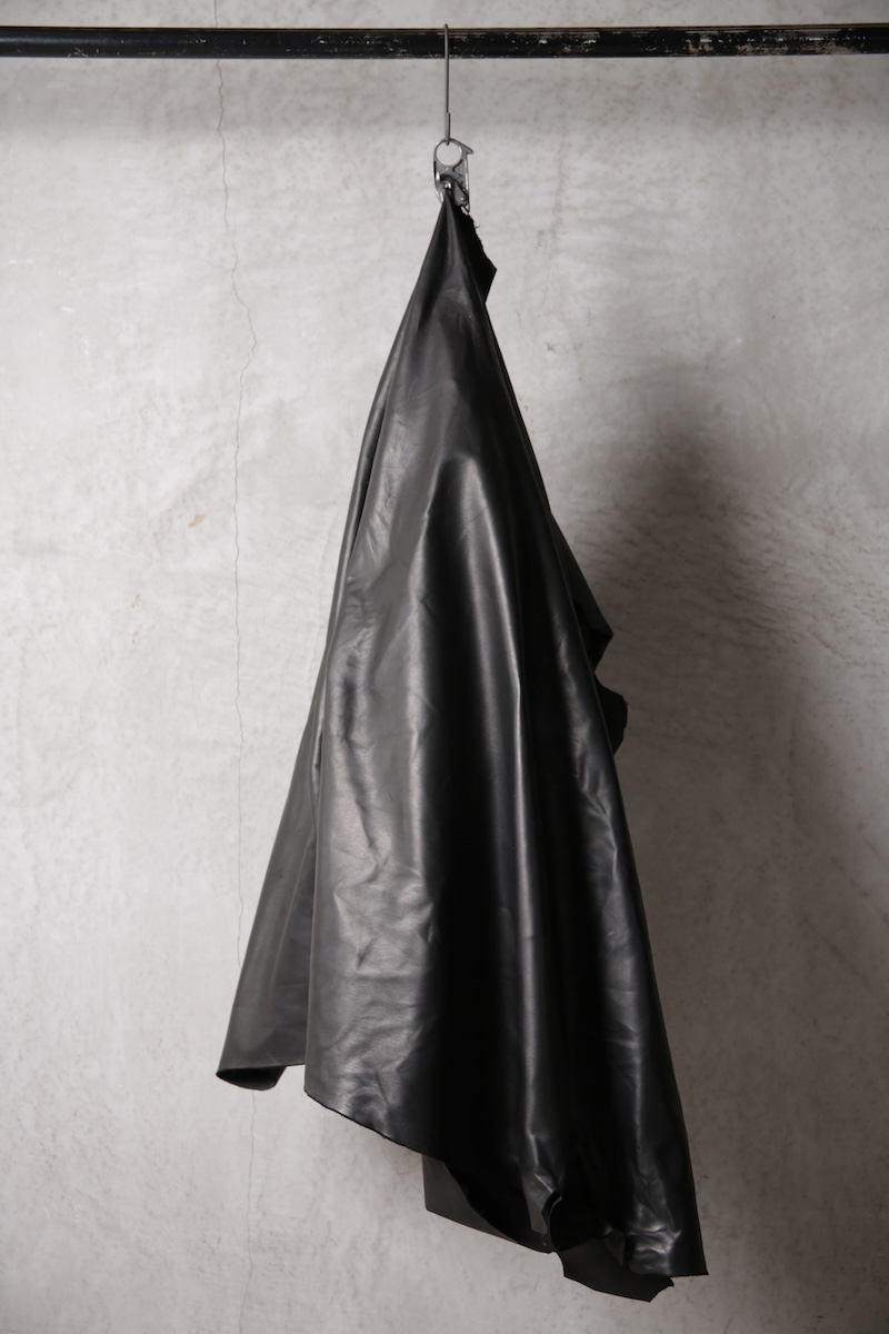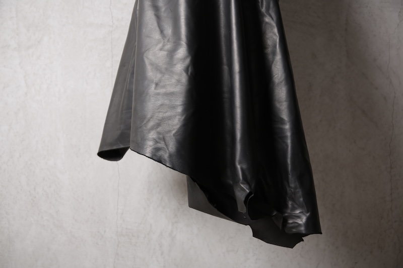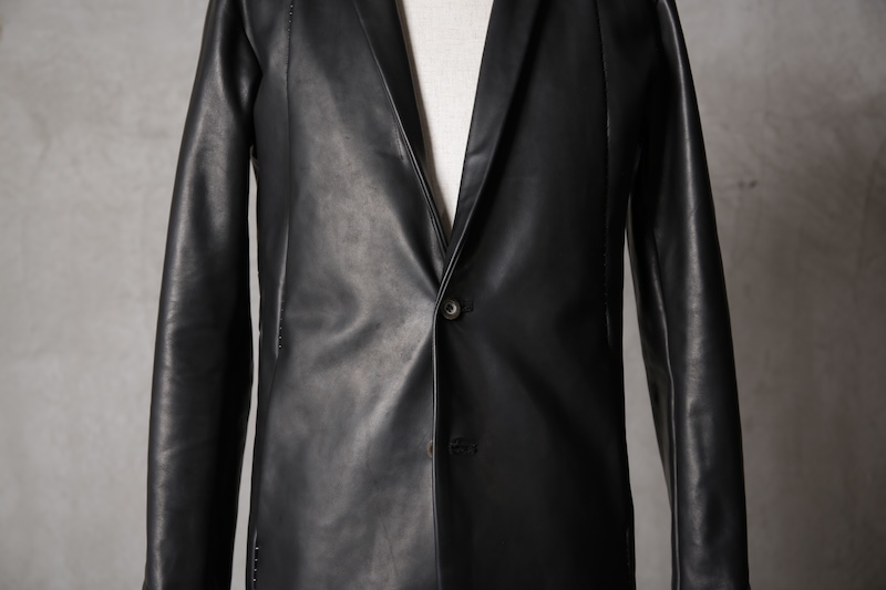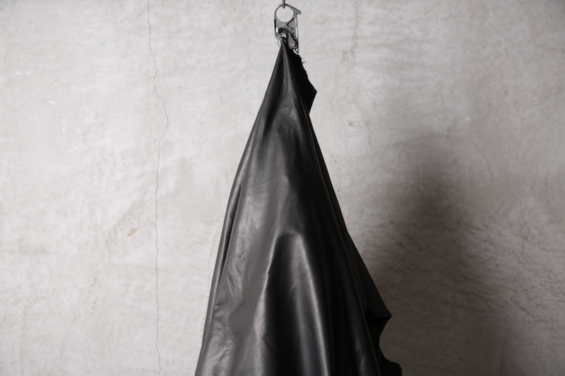 北欧由来の原皮を下地として使用し革に触れた瞬間に感じることが出来る最大の特徴にして最難関であった多量過ぎるオイルの質感である。そのウェットでありヌメリ感はあまりに特殊であり革という原始であり原点的な意味合いにおいてもその血とも呼べる特徴をこのオイル感によって深く味わって頂くことが出来ると思っている。オイルを多量にすることで馴染みの良い質感を革に与えながらもシワ残りするホースの特徴を消すことなく着用を繰り返す中で自分だけのシワが刻み込まれ無二の存在へと昇華していく。単なるレザー作りではなくその世界観自体をこの革を持って創造したかった。そしてそれを具現化したのがこのレザーとなる。