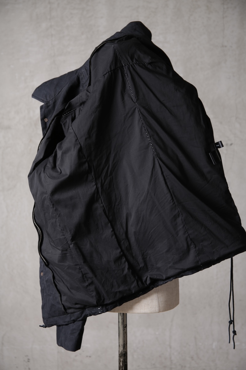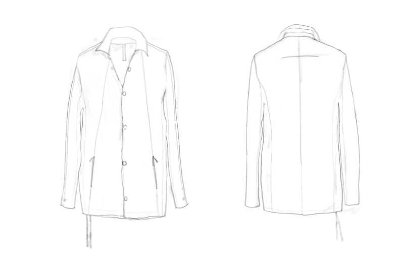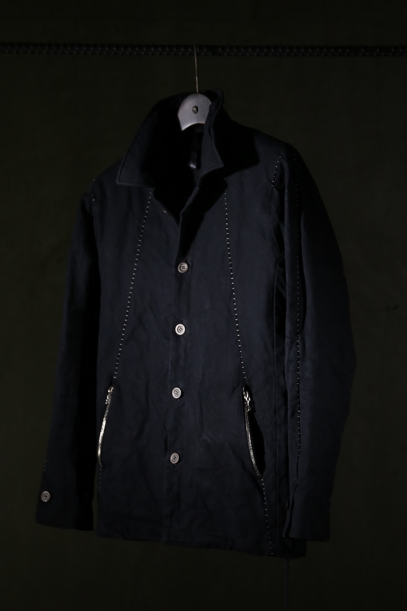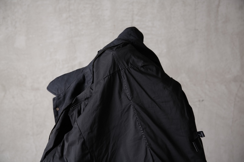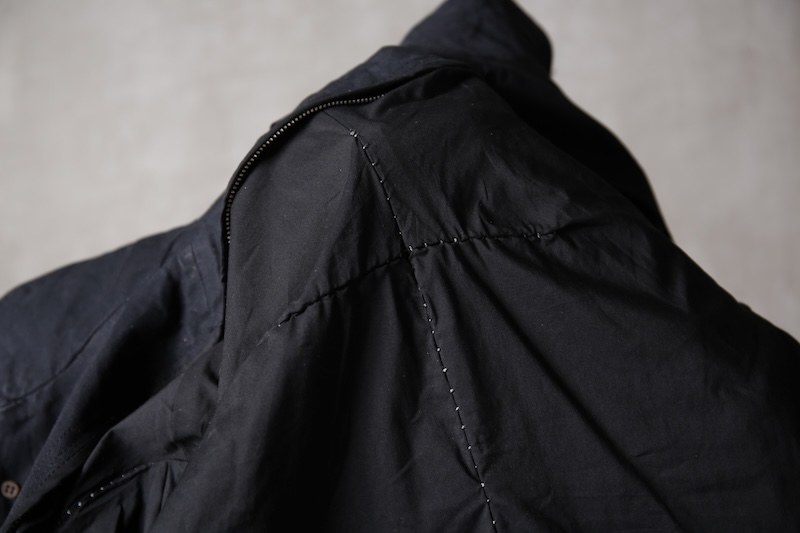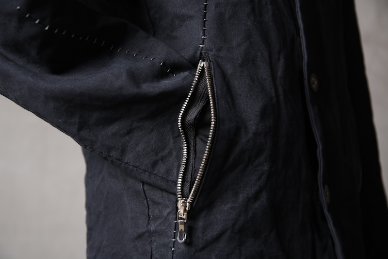 その実描き上げてみるとそれは壮大でどこまでも終わりのないデザインへと昇華した。ネックライン脇に流れるハの字の構造を持つ切り返しの先にはジップとスリット型のダブルポケット構造で実際の使い勝手とデザインを融合させた。肩からアームラインに掛けては脇下のシームラインを持たないハーヴェストスリーブ構造となっており全体の運動可動域を大きくさせる。その流れからの袖先はフォーマルジャケットにも採用させる本開き仕様。