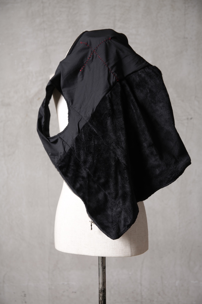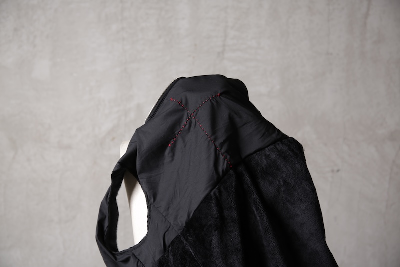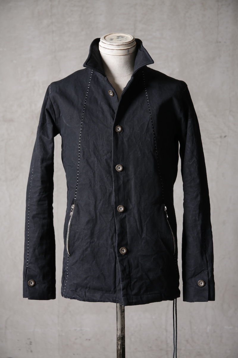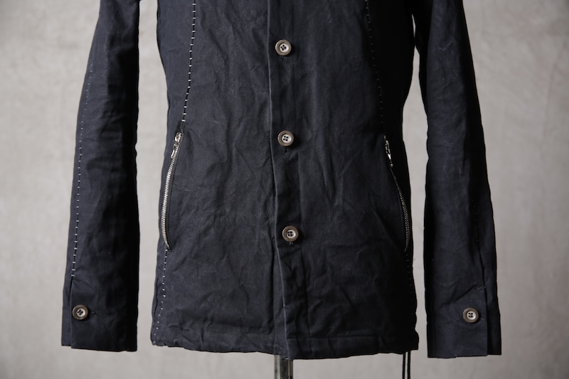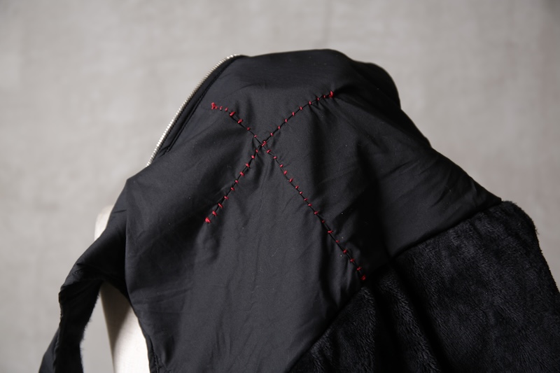 その実描き上げてみるとそれは壮大でどこまでも終わりのないデザインへと昇華した。ネックライン脇に流れるハの字の構造を持つ切り返しの先にはジップとスリット型のダブルポケット構造で実際の使い勝手とデザインを融合させた。肩からアームラインに掛けては脇下のシームラインを持たないハーヴェストスリーブ構造となっており全体の運動可動域を大きくさせる。その流れからの袖先はフォーマルジャケットにも採用させる本開き仕様。