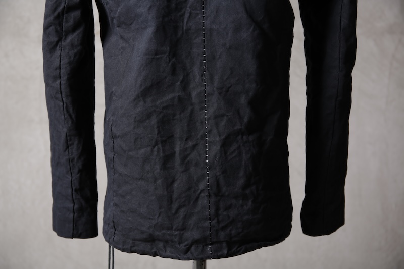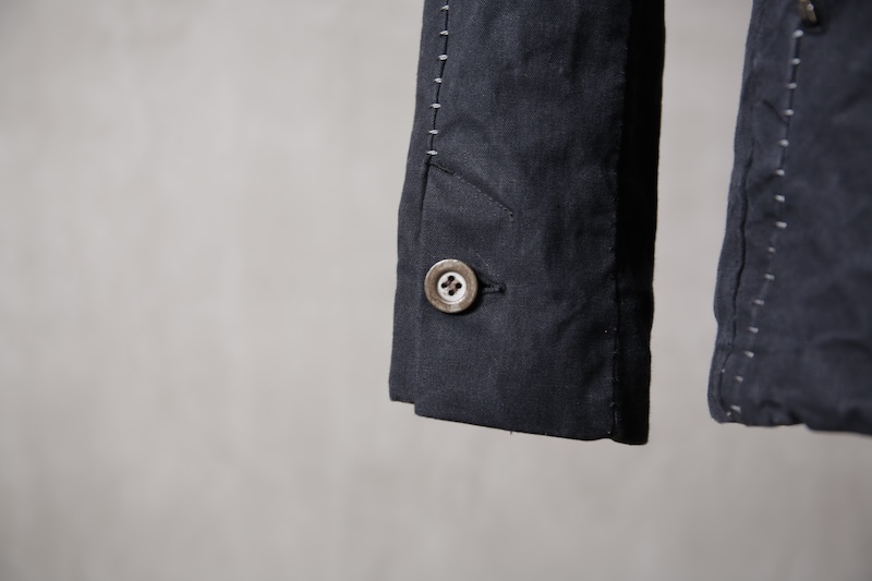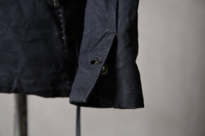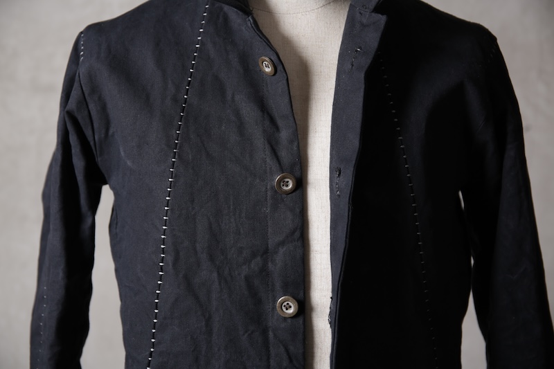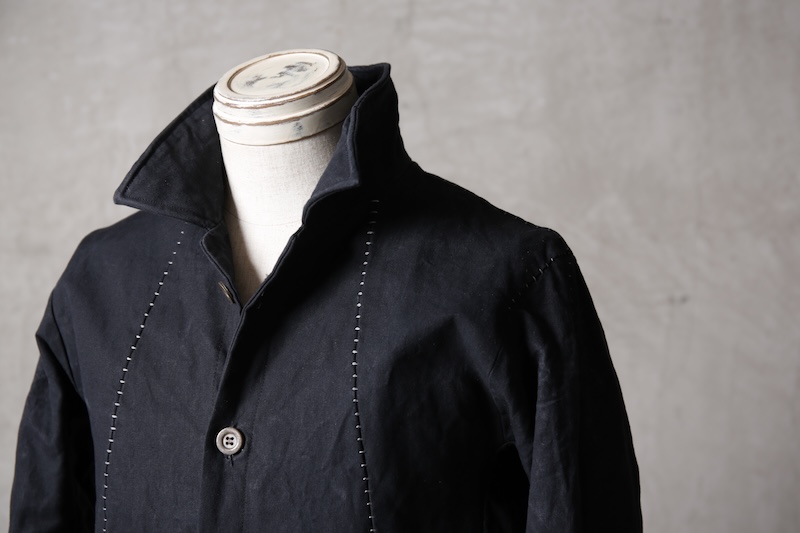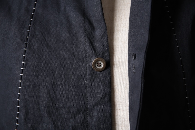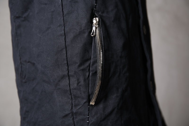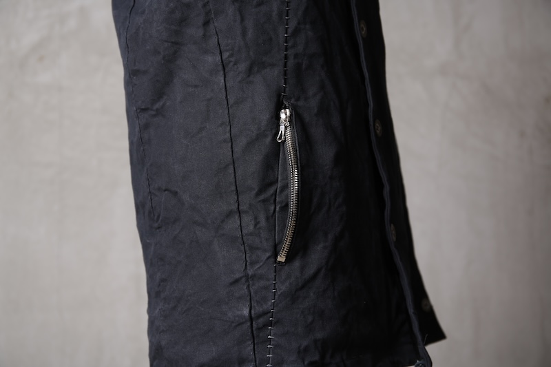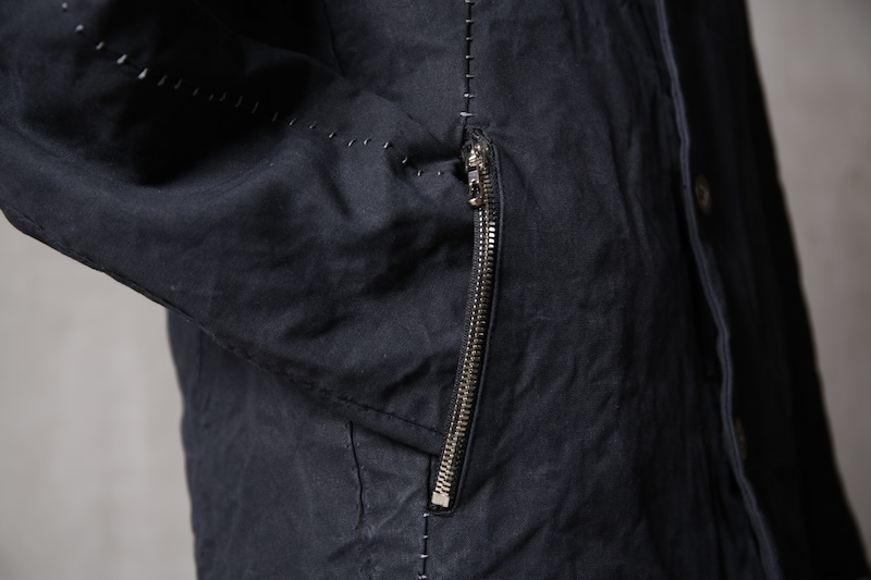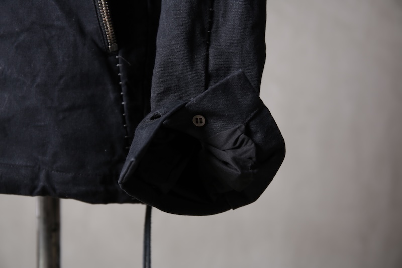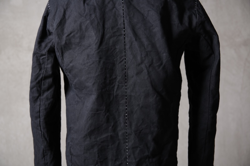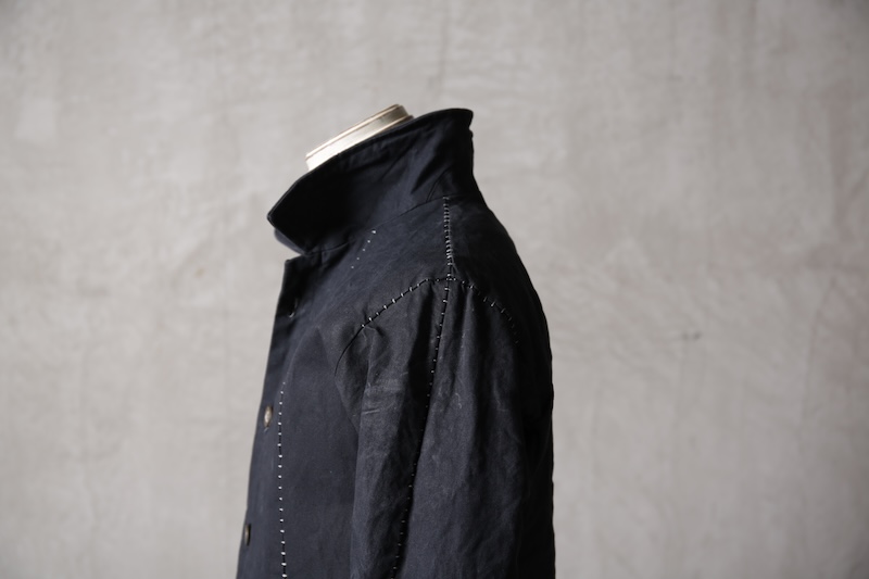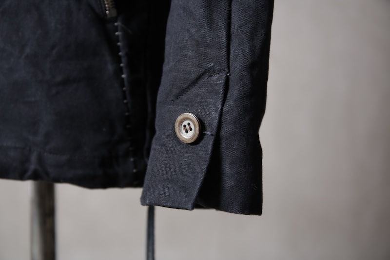 着込むごとにそのシワは深く刻まれ、またワックスが経年で擦り始めることでその表情自体に陰影が生まれることで布帛ながらもレザーやデニムと同様に育っていくことを味わってもらえる素材として完成している。ノンストレッチでもあり決して着用しやすい素材ではないからこそ、愛情が深く刻まれていくのではないだろうかと考える。