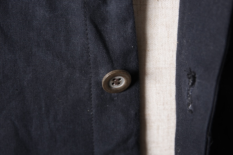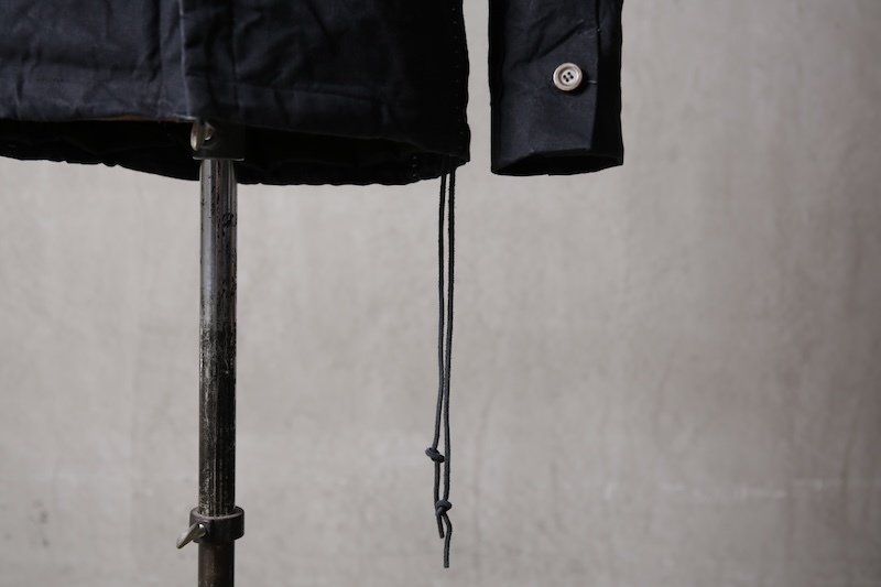 戦前から現存する台数が非常に限られたコットンの厚織機械を用いて織られた79号生地で、軍モノのテント生地やズタ袋などに使用されてきた歴史的な意味合いも持った素材である。重厚に織られたこの生地を染加工段階で生地にパラフィンワックス加工を施しており科学技術が発展する以前の旧時代の撥水性を得ている。(デザインとしては撥水性の意味合いよりもワックスが持つ硬さと経年着用によるチョークマークを含めた味わいのためと言えるのだけれど)
