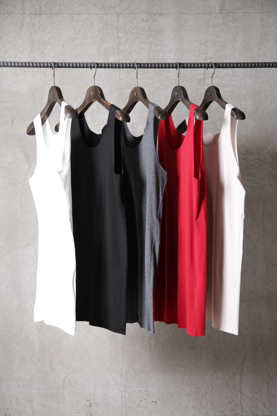 とにかく普遍で不変。最高で最強のインナーウェアのアイテムである。デザイナー自身にとって不可欠なアイテムであるタンクトップ。真夏以外の季節のタンクトップはこれがあれば事足りると言っても言い過ぎでないほどに完成されたアイテム。