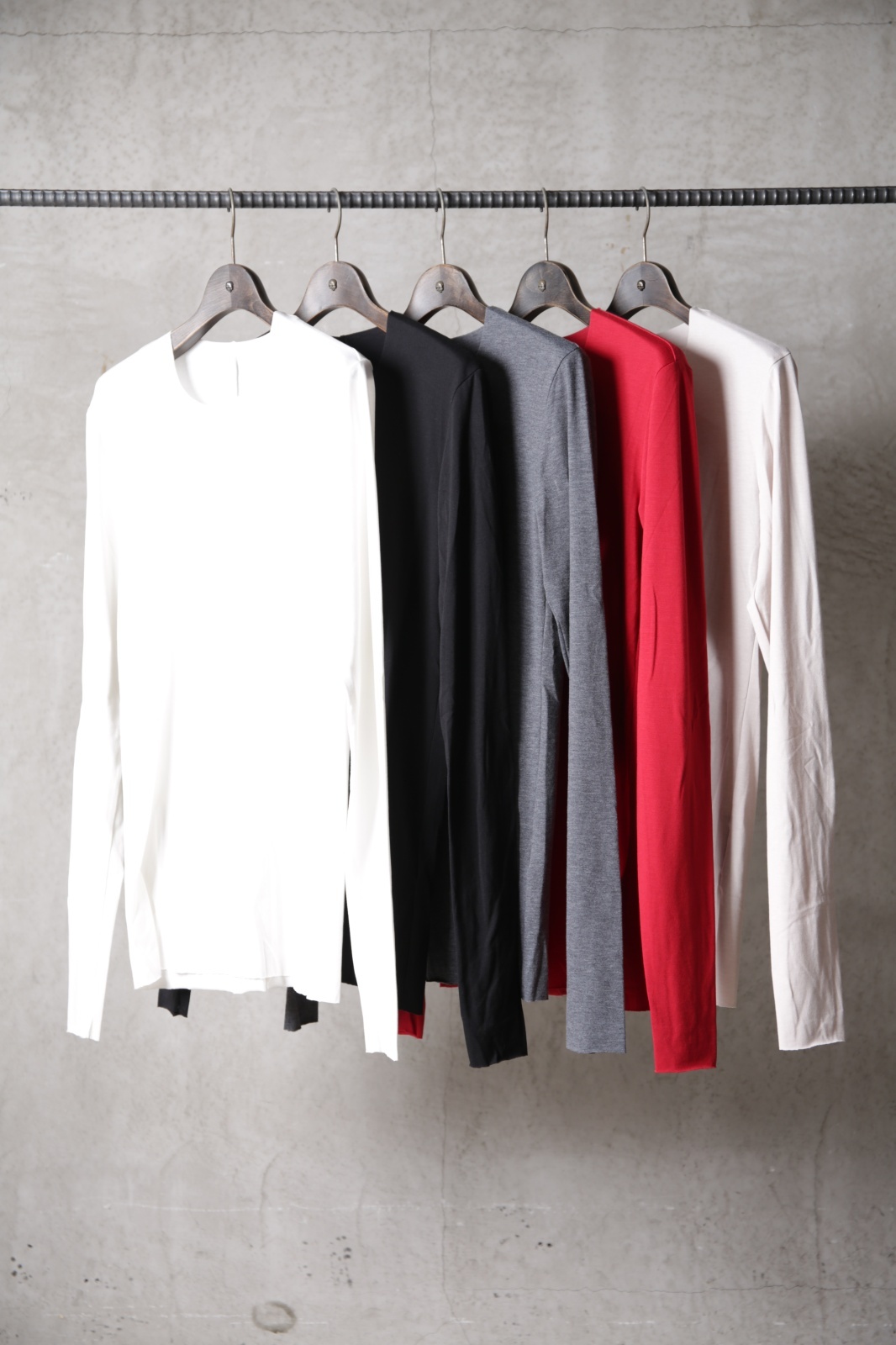 とにかく普遍で不変。最高で最強のインナーウェアのアイテムである。デザイナー自身にとって不可欠なアイテムであるロングスリーブカットソー。真夏以外の季節では同素材のタンクトップとのレイヤードスタイルがあれば事足りると言っても言い過ぎでないほどに完成されたアイテム。