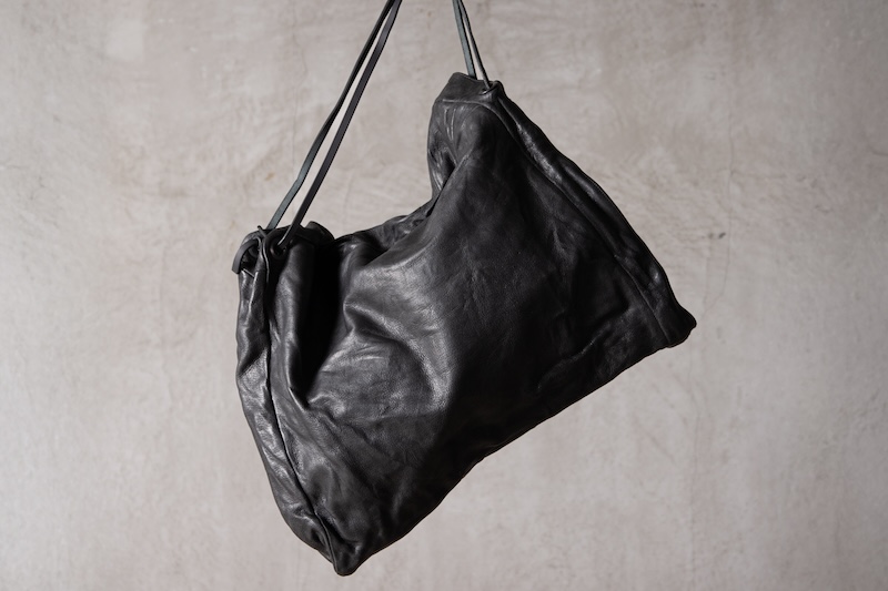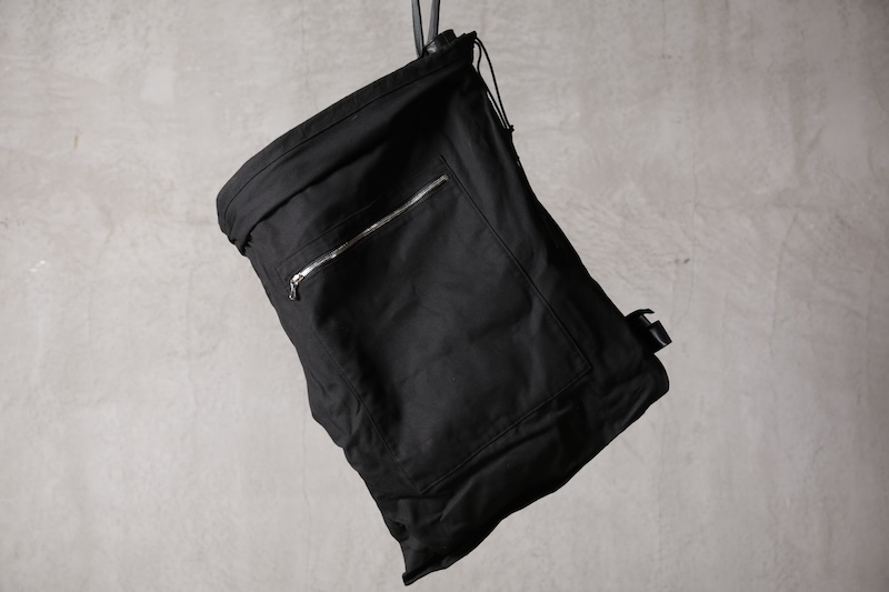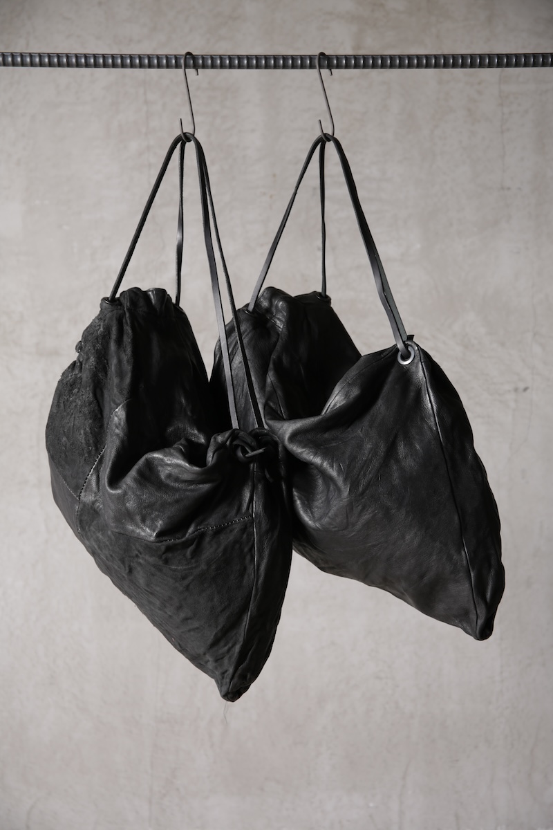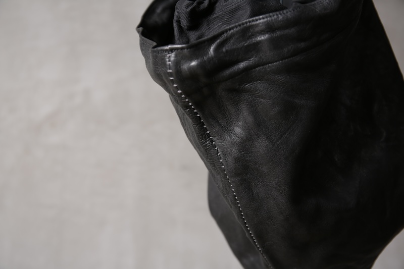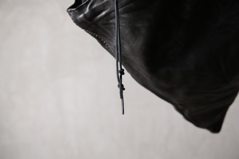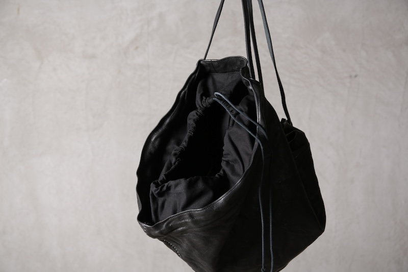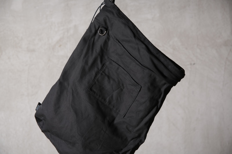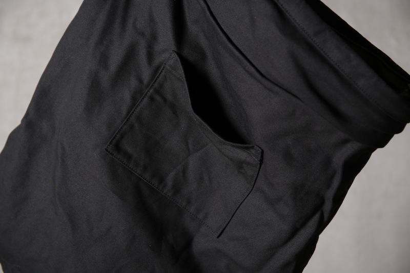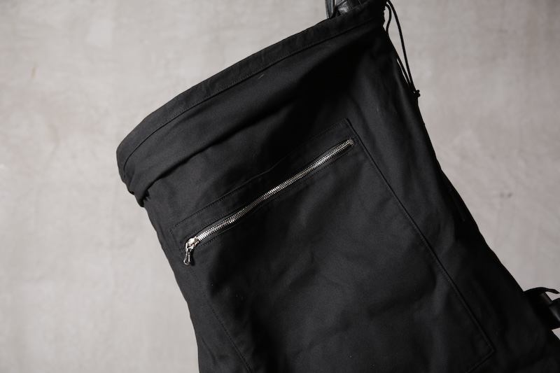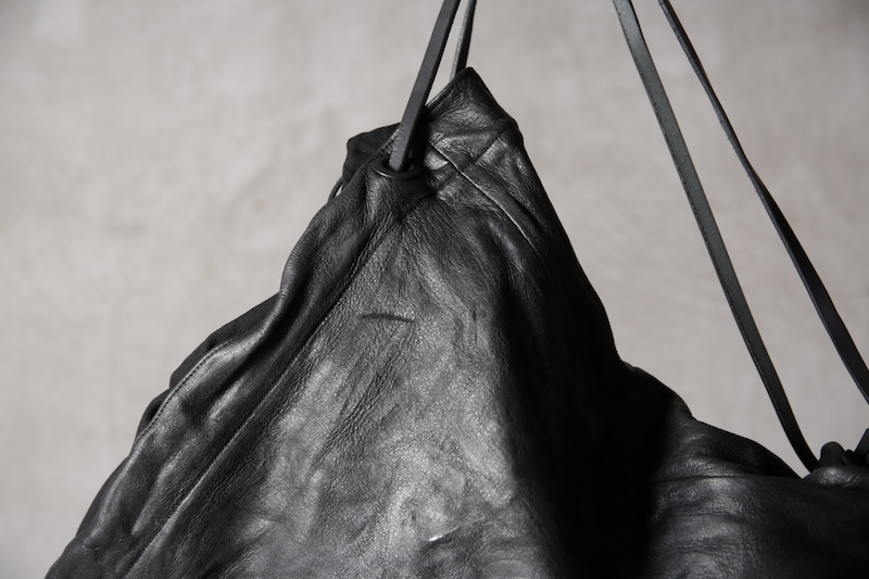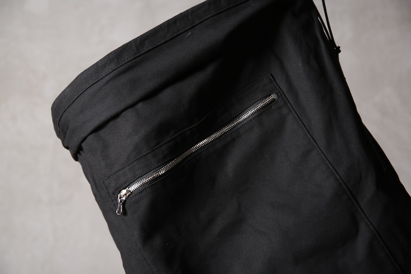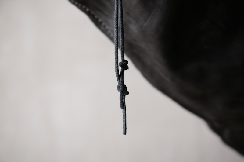 ショルダー部分は重厚なレザーベルト、バックの内面と外界を遮断するのはイタリア製のフルベジタブルタンニンレザーコードを用い、裏地にはざっくりとした目が特徴で経年での耐久性が高い極厚のオックス生地を採用した。ショルダー部分を通す無骨なハトメの形状やインナー部分にはファスナーのついた内ポケット構造とKEYホルダーを着用できるDリングも配しており外側からは見えない部分のディティールにもこだわった秀逸アイテム。