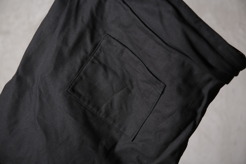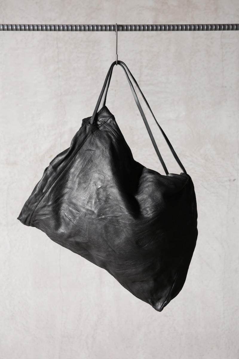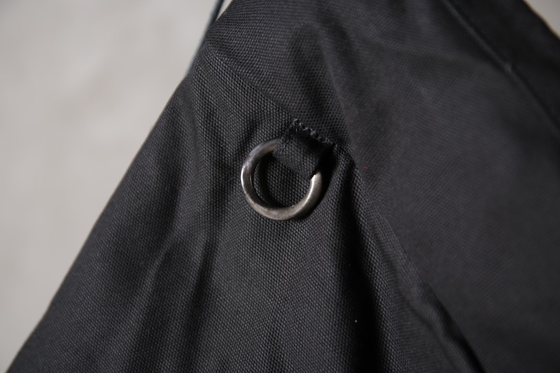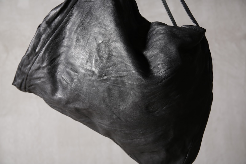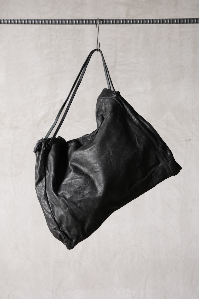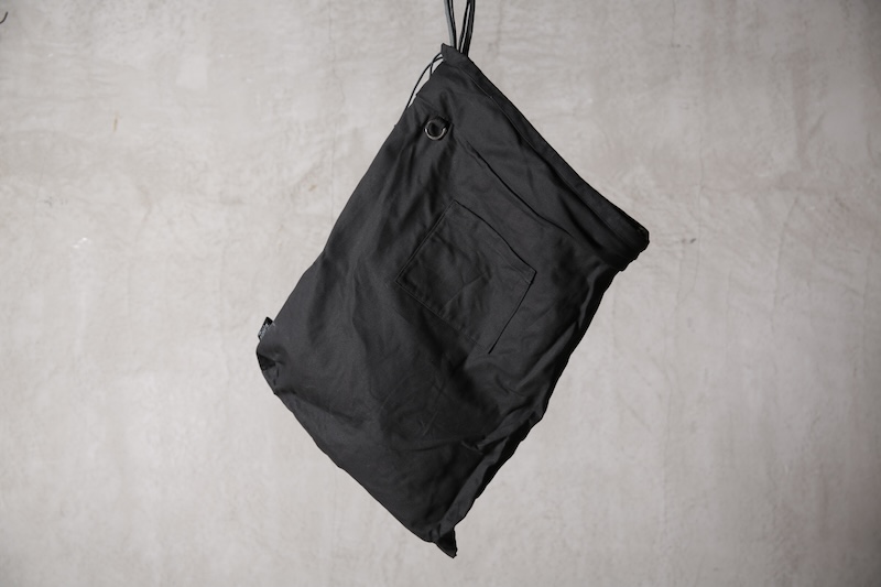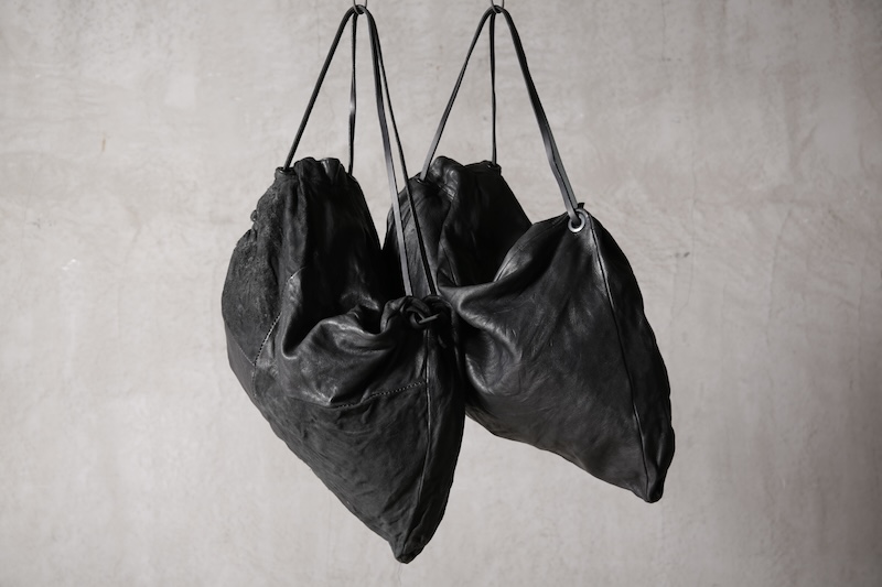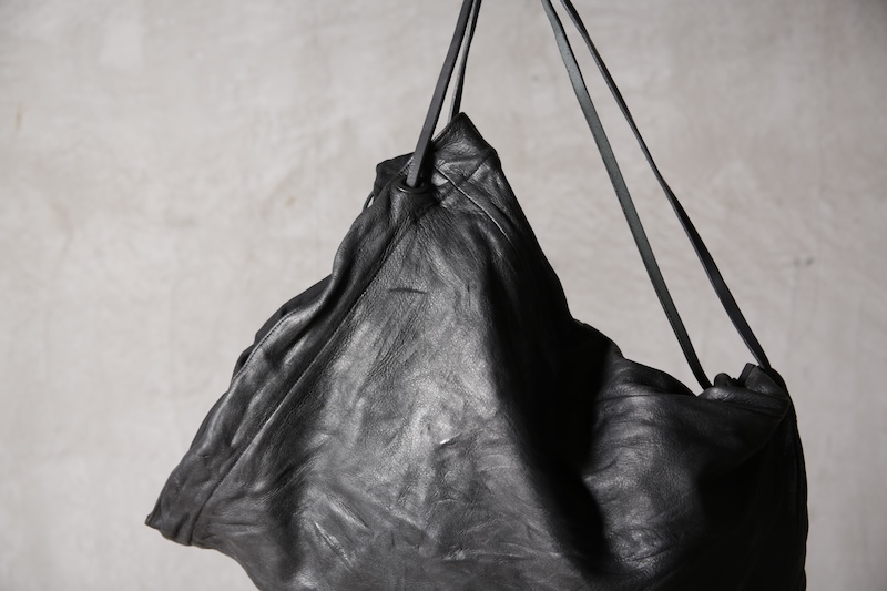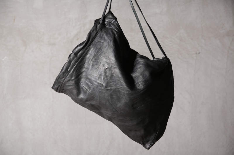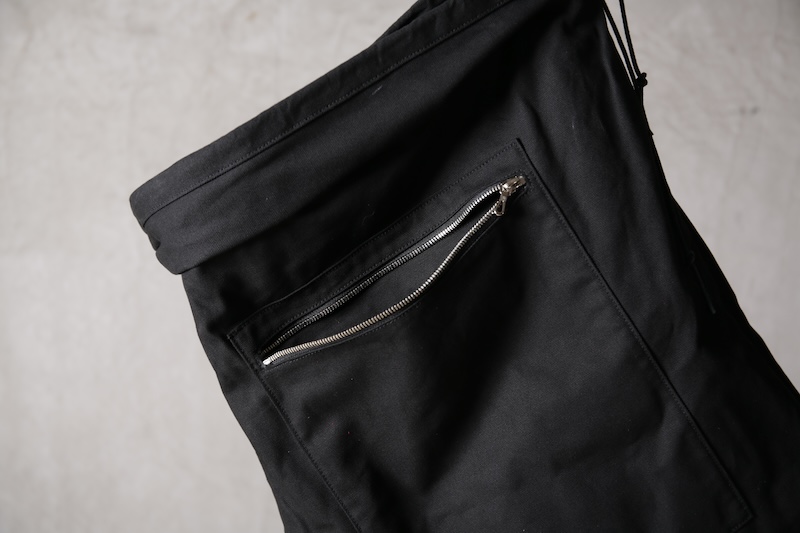ショルダー部分は重厚なレザーベルト、バックの内面と外界を遮断するのはイタリア製のフルベジタブルタンニンレザーコードを用い、裏地にはざっくりとした目が特徴で経年での耐久性が高い極厚のオックス生地を採用した。ショルダー部分を通す無骨なハトメの形状やインナー部分にはファスナーのついた内ポケット構造とKEYホルダーを着用できるDリングも配しており外側からは見えない部分のディティールにもこだわった秀逸アイテム。