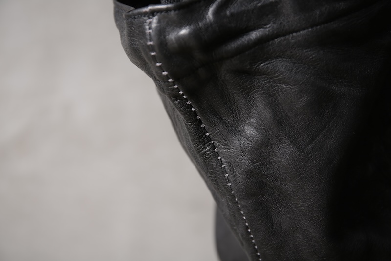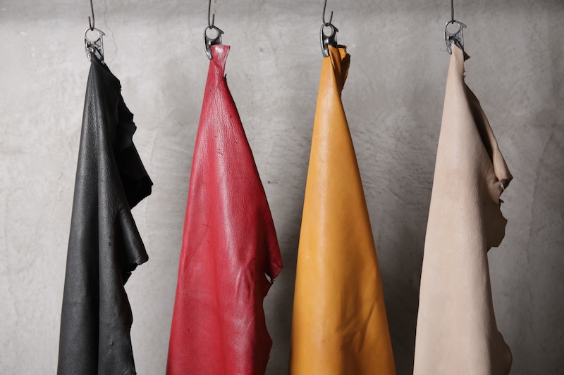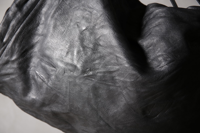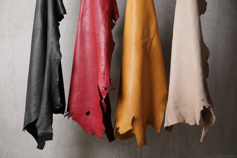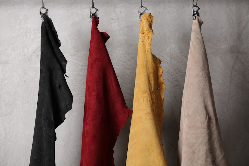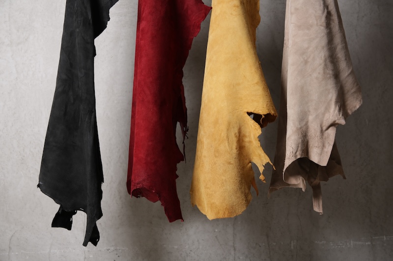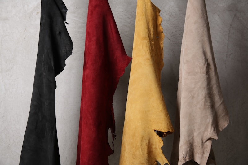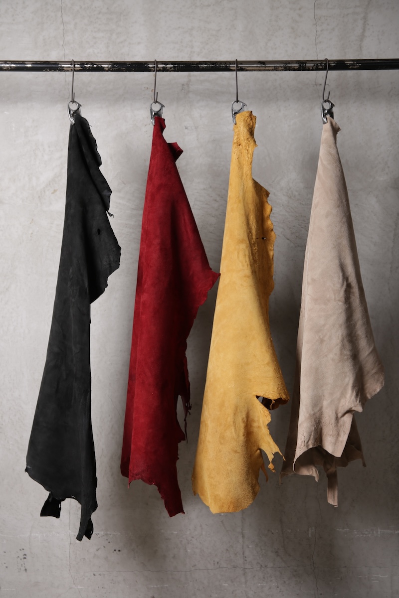 「この先」へのその象徴と位置づける完全なオリジナルのディアスキンレザー(鹿革)。ブランドオリジナルのレザーはこの世に多く存在するが、その中でも原皮自体から僕自身が着手して生み出した稀有なレザーとも言える。原皮となる鹿皮はデザイナーの出身地である長野県のものを使用。害獣駆除として通常処分されてしまう天然の鹿の貴重な原皮を塩漬け前のまさしく原皮そのものからデザイナーが直接買い付け、日本が誇るレザーの街である兵庫県姫路市の専属タンナーと共にフルベジタブルタンニンで仕上げた。原皮そのものから完全なるオリジナルレザーとしてこのブランドの未来性をも描く重要なファクターであり、本来処分されている皮を輪廻の意味合いも込めて新たな命を吹き込む大切な意味合いを含んだ素材となる。革の中でも1番の引き裂き強度を持ち、しなやかなディアレザーの特性を活かしつつもその荒々しく厳しい天然世界を生き抜いて来た鹿ならではの荒々しい表情が大きな特徴。唯一無二の存在であるオリジナリティをぜひ体感して欲しい。ディアレザーはその特有のしなやかさと革の美しさを持っているためバックスキン(スウェード)も非常に艷やかで素肌に直接触れても不快感が少ないこともまた特徴である。
