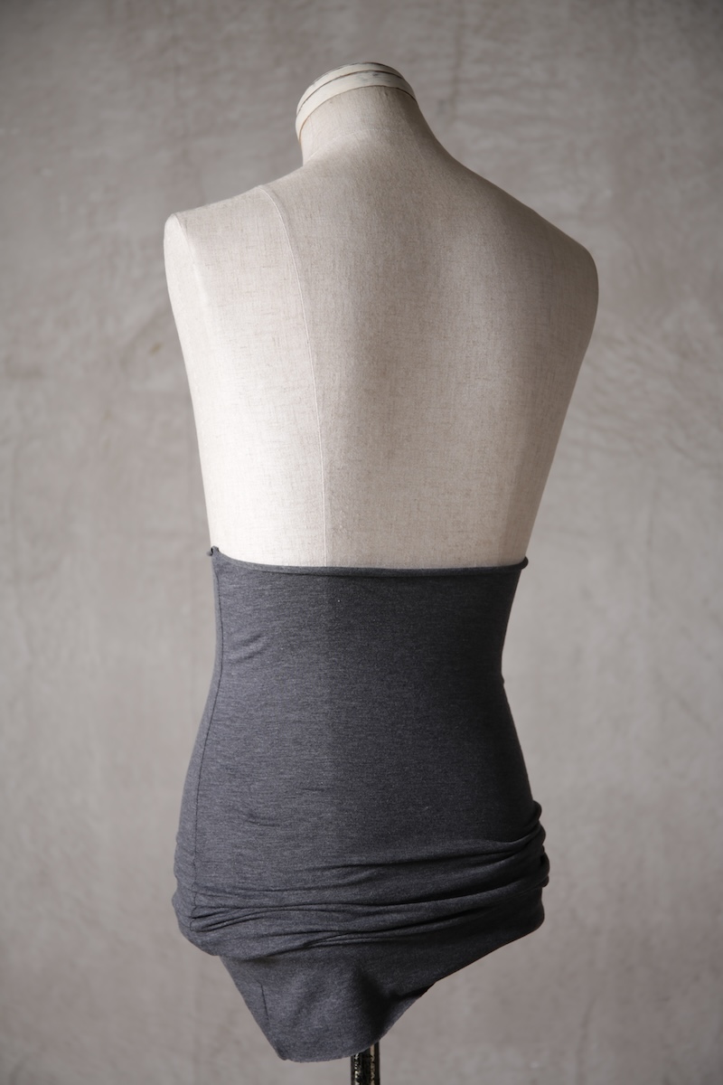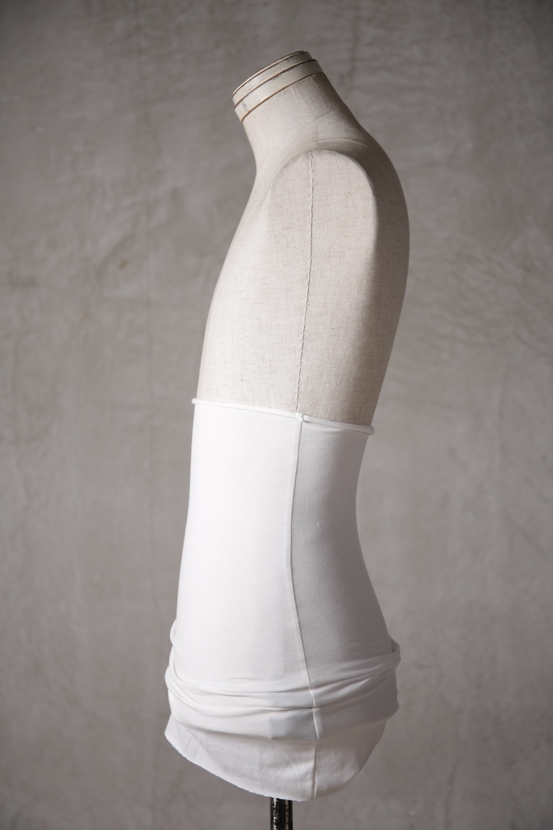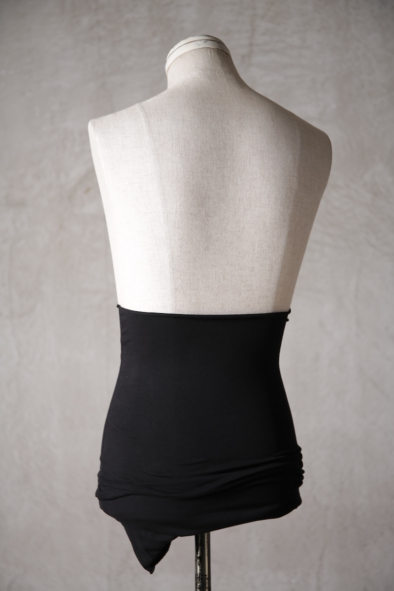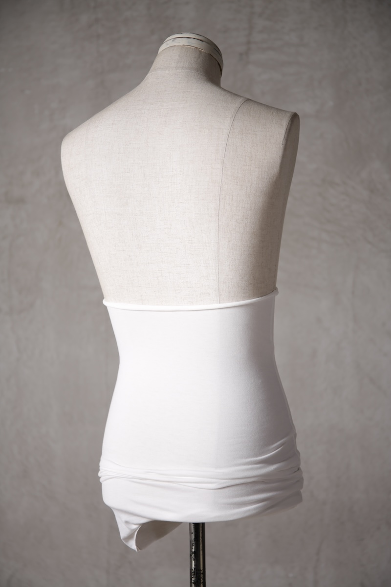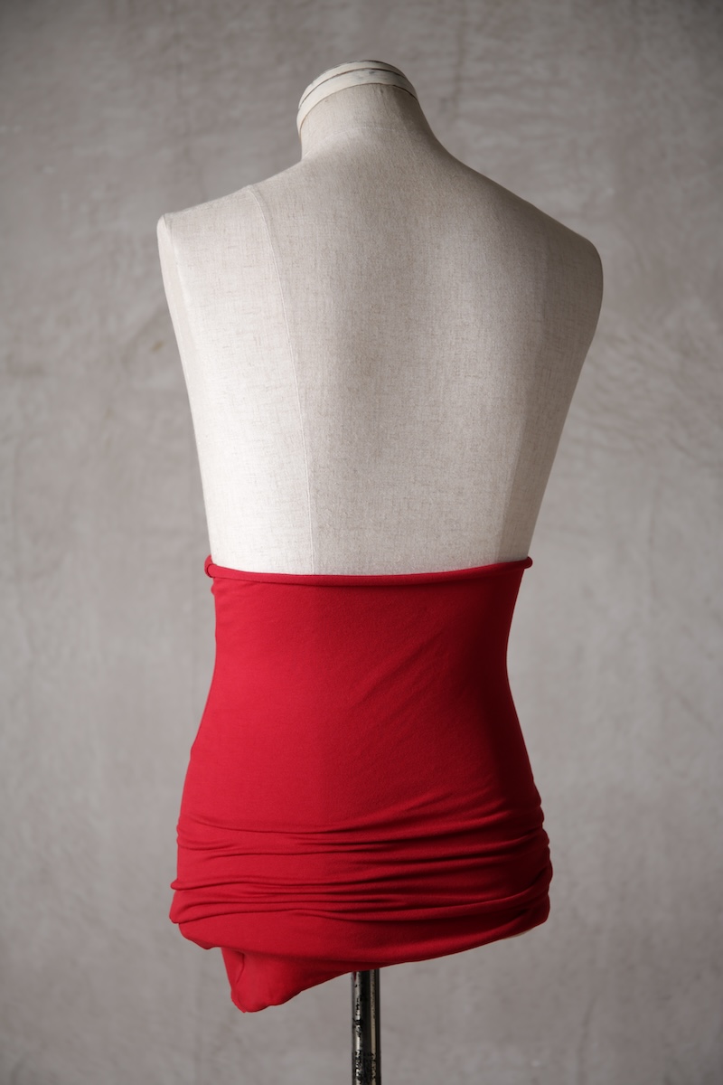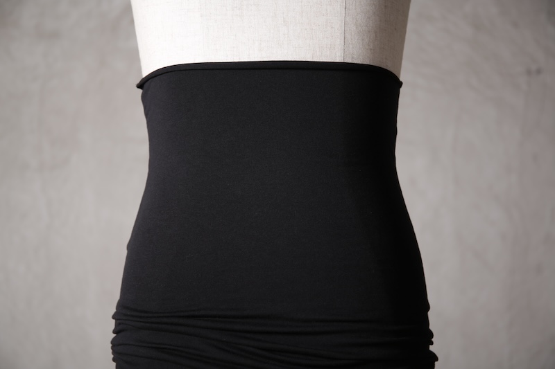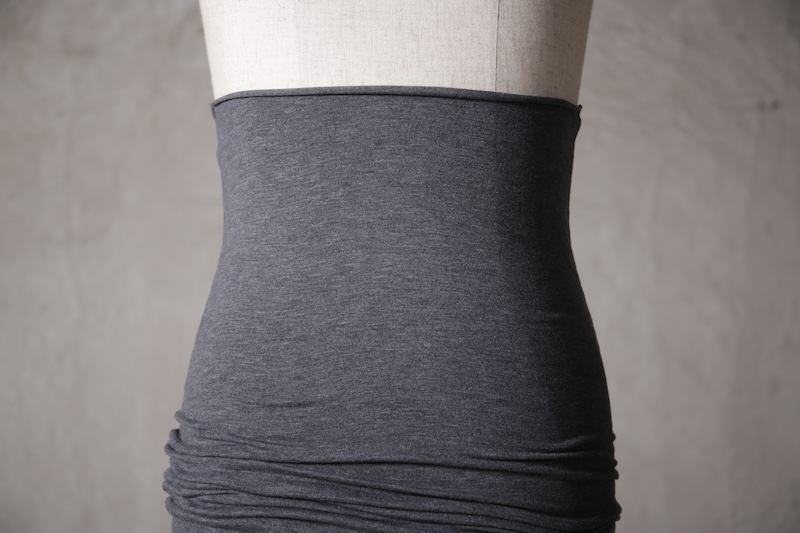 伸縮性のある素材であるからこそ可能なスタイルで使い方によって幅広い可能性を秘めているのが大きな特徴。