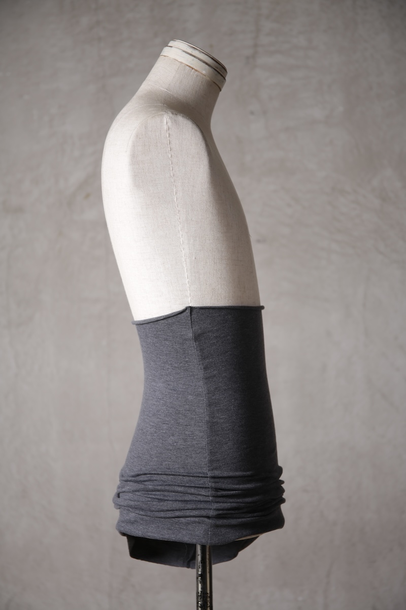 レーヨンが持つ独特の鈍く光るそのさまは妖艶で美しい。まさに朽ちていく姿を素材として演出する。極薄であるにも関わらず驚くほどの保温性を持つもの特徴で一度着用するとそれはまさしく中毒に似た感覚に陥ると思う。