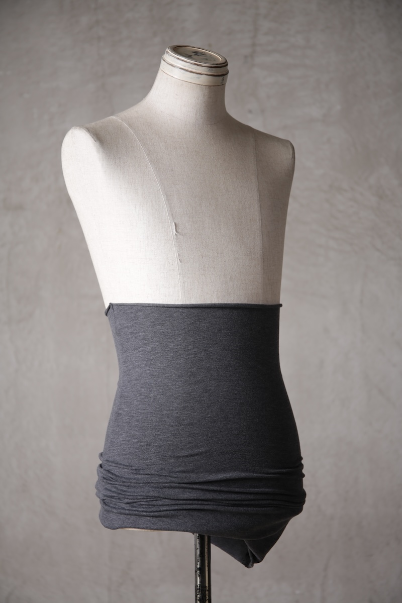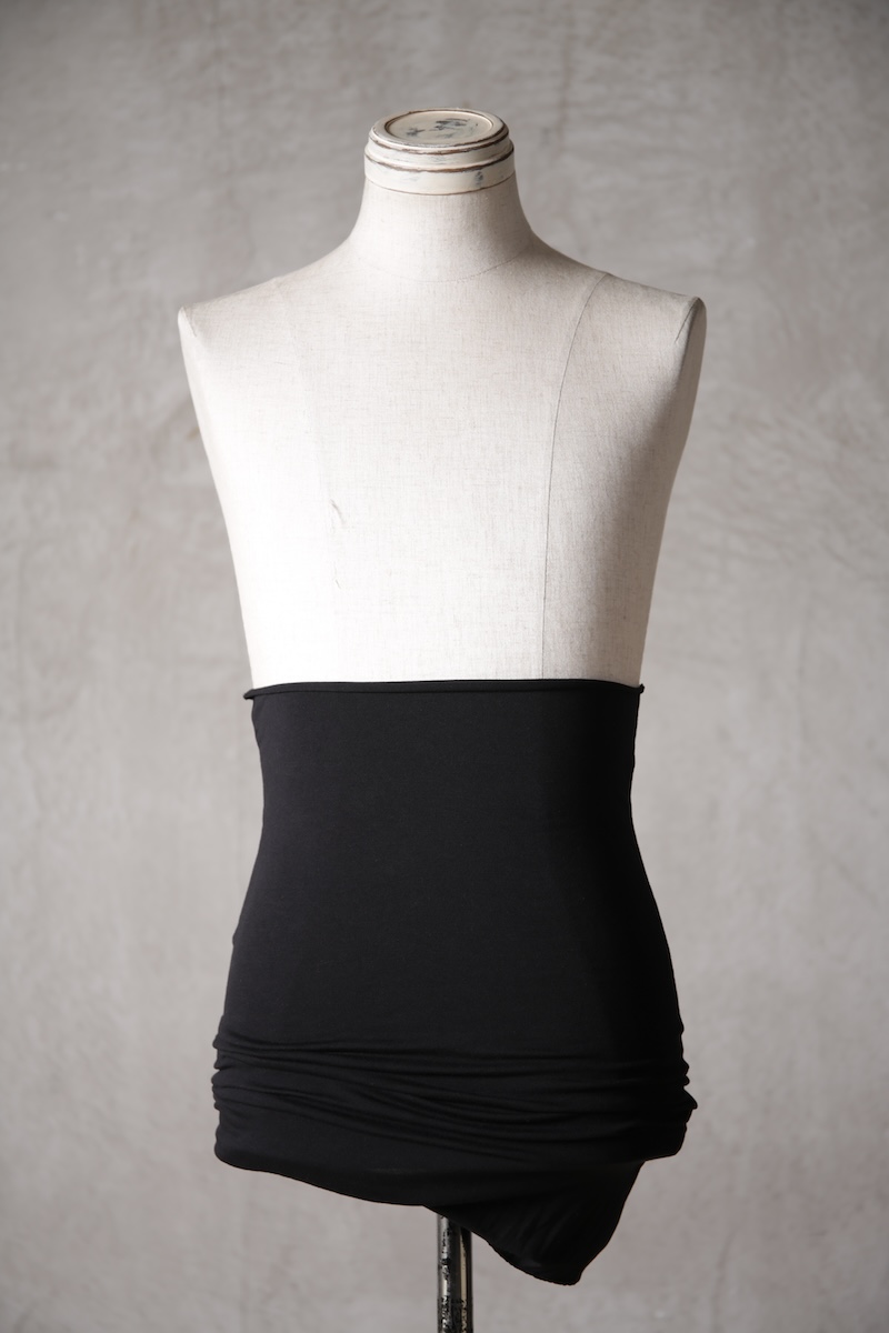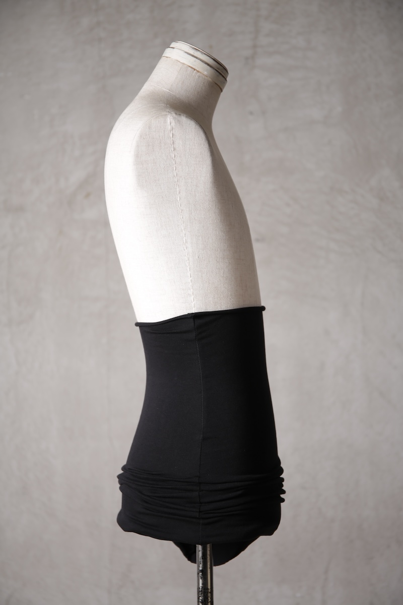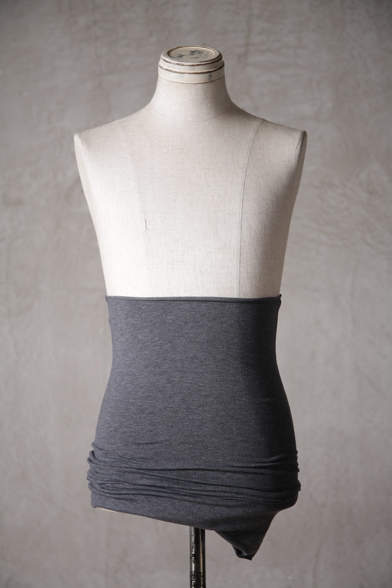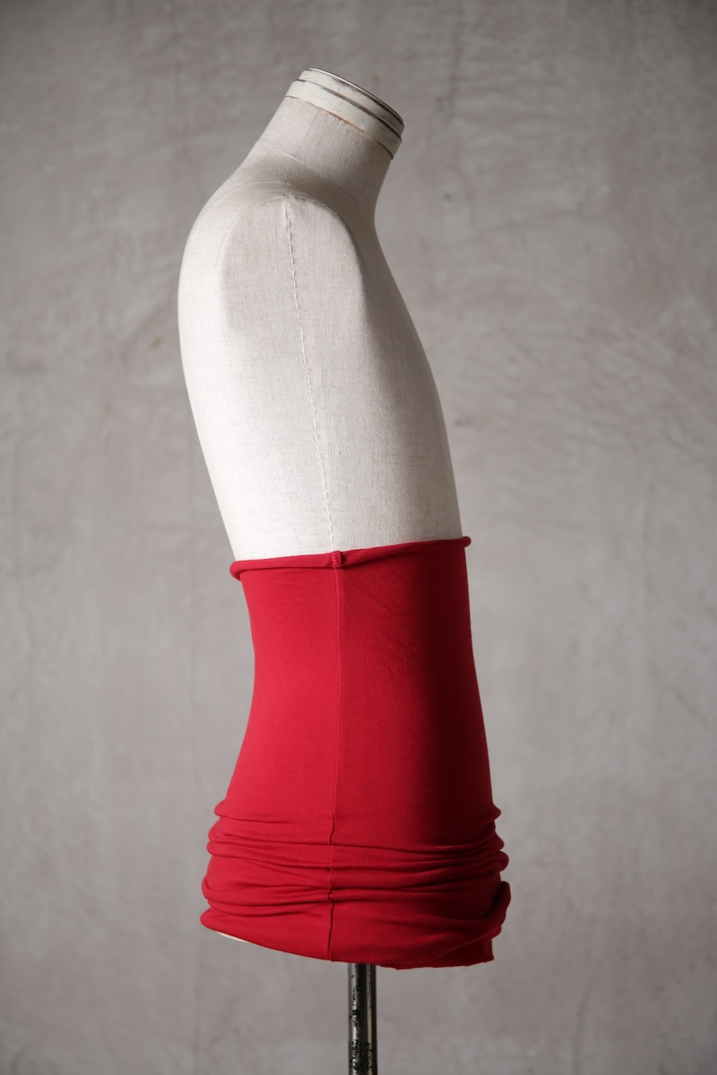 ある種の驚愕アイテムで実際的な防寒性という機能と共に「機能美」を兼ね備えた腹巻アイテム。このブランドのアイコン的なスタイルとも言えるカラーレイヤードのカットソーの組合せの最小公約数で実現出来るアイテムとなっている。通常であればタンクトップや袖付きのカットソーとの組合せでのレイヤードをこの腹巻と重ね合わせることで裾からお好きなカラーリングを見せることで魅せるスタイルへと昇華させる。