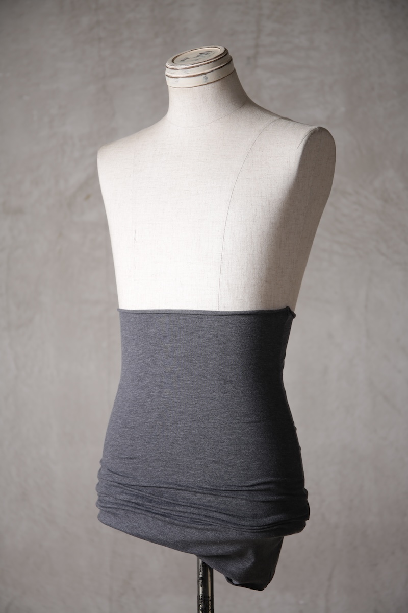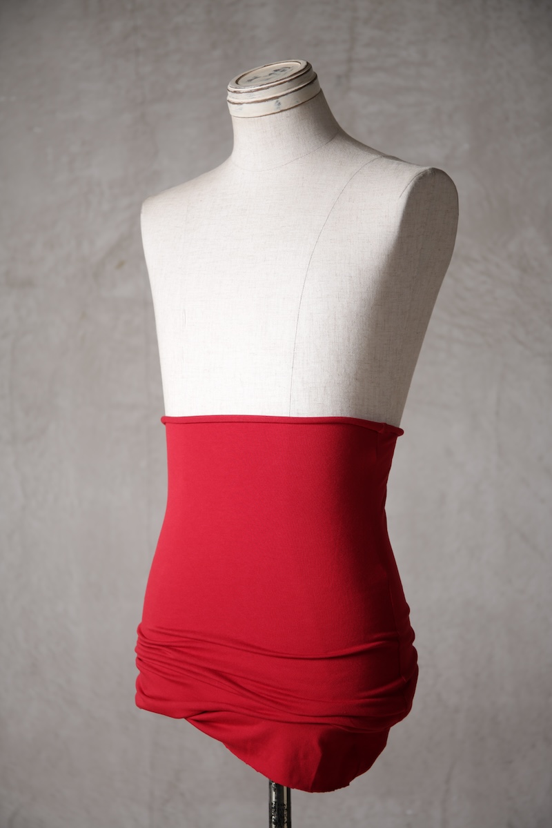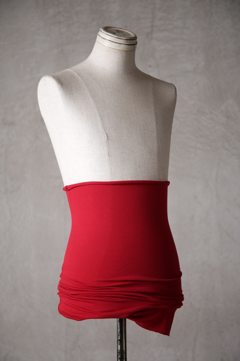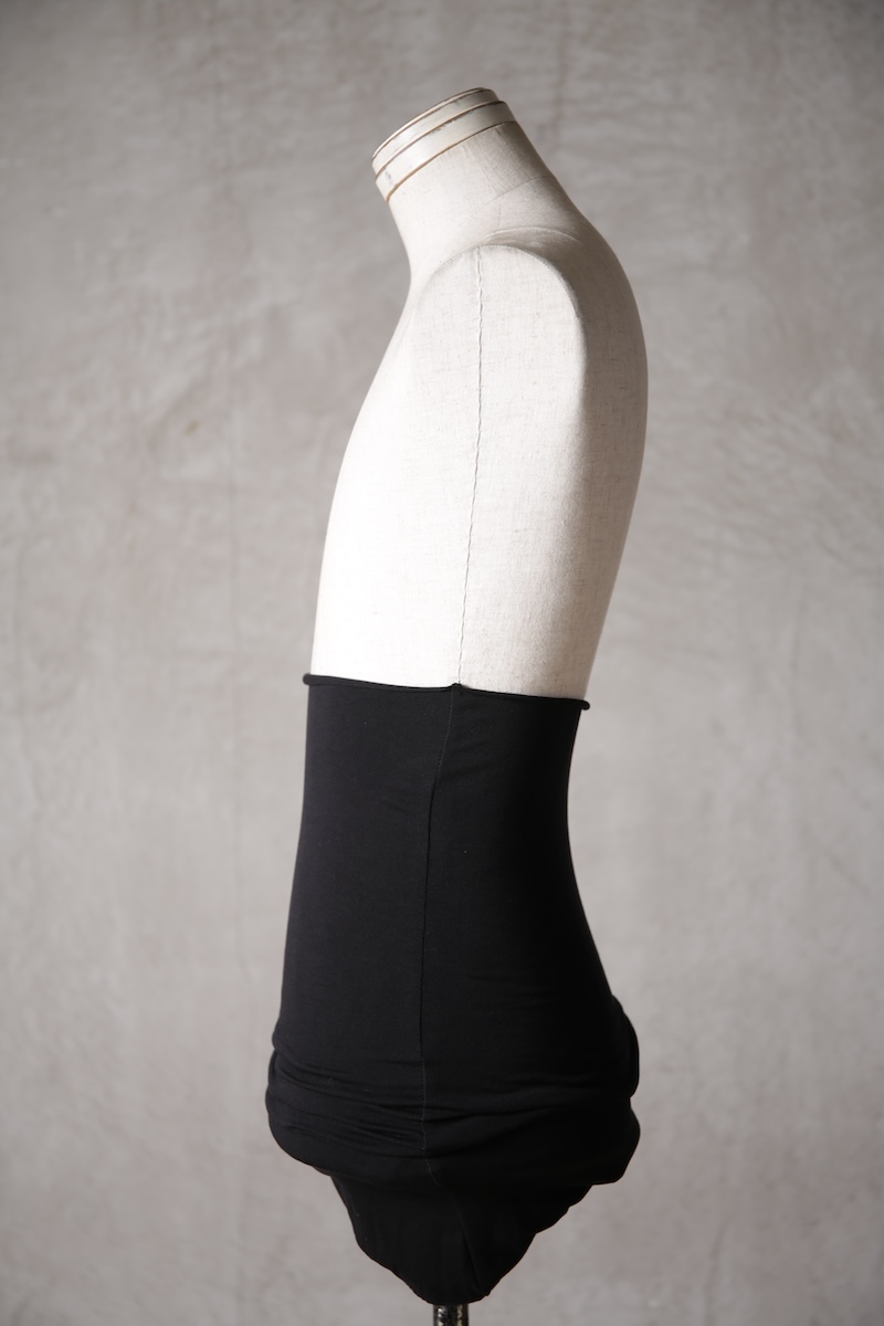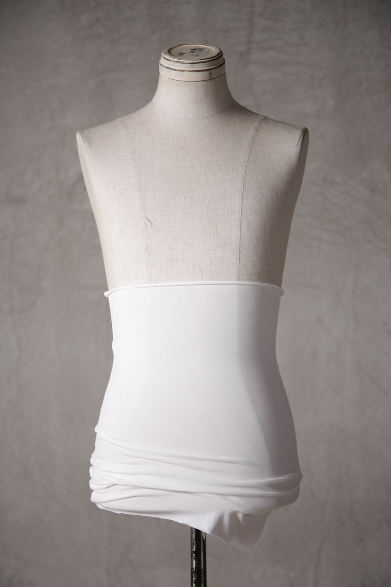 ある種の驚愕アイテムで実際的な防寒性という機能と共に「機能美」を兼ね備えた腹巻アイテム。このブランドのアイコン的なスタイルとも言えるカラーレイヤードのカットソーの組合せの最小公約数で実現出来るアイテムとなっている。通常であればタンクトップや袖付きのカットソーとの組合せでのレイヤードをこの腹巻と重ね合わせることで裾からお好きなカラーリングを見せることで魅せるスタイルへと昇華させる。
