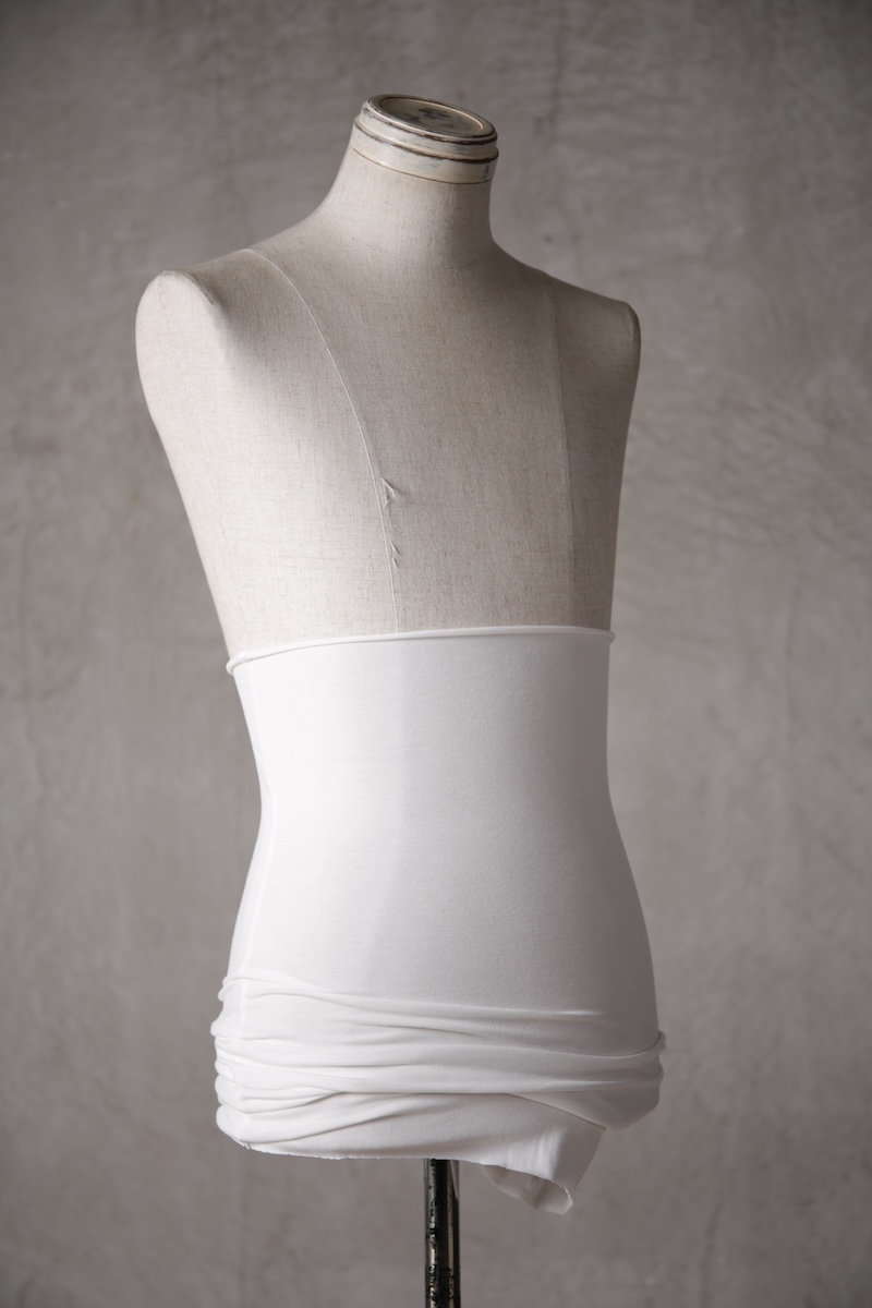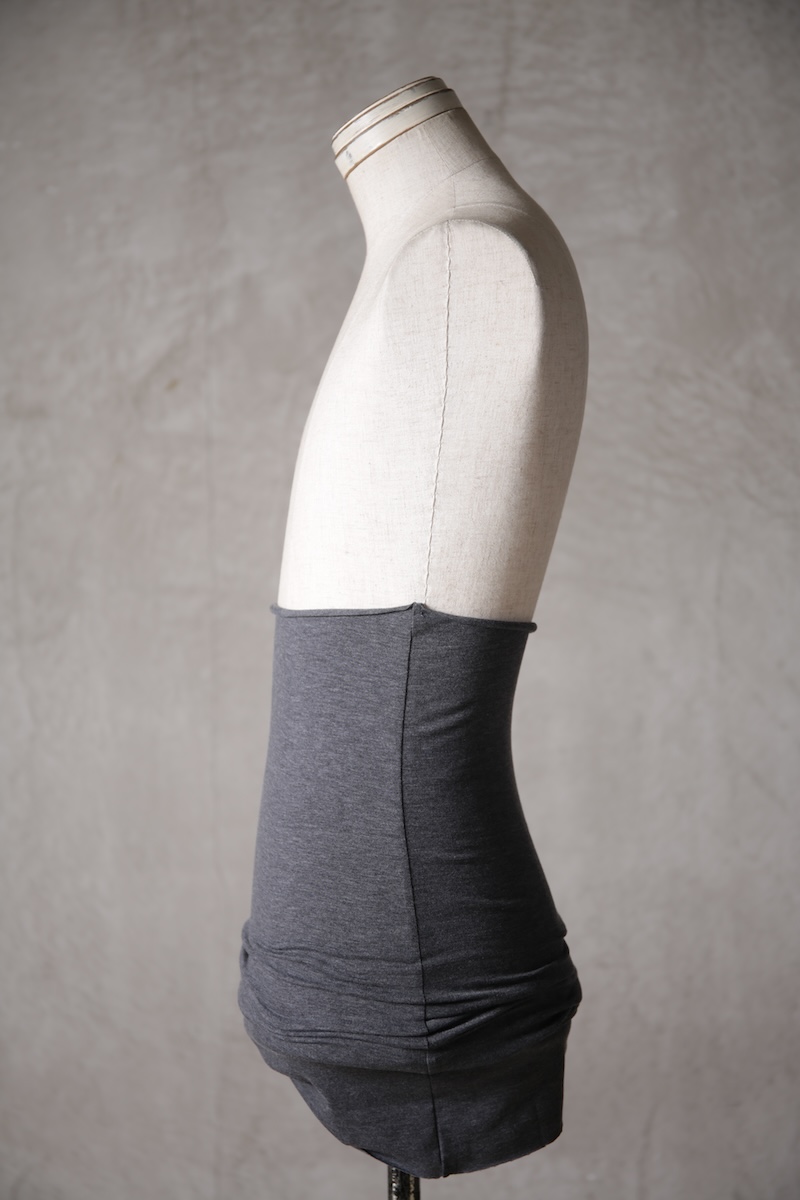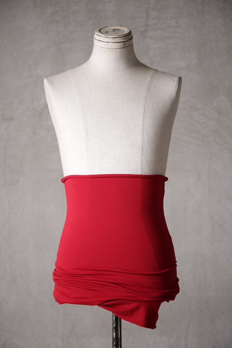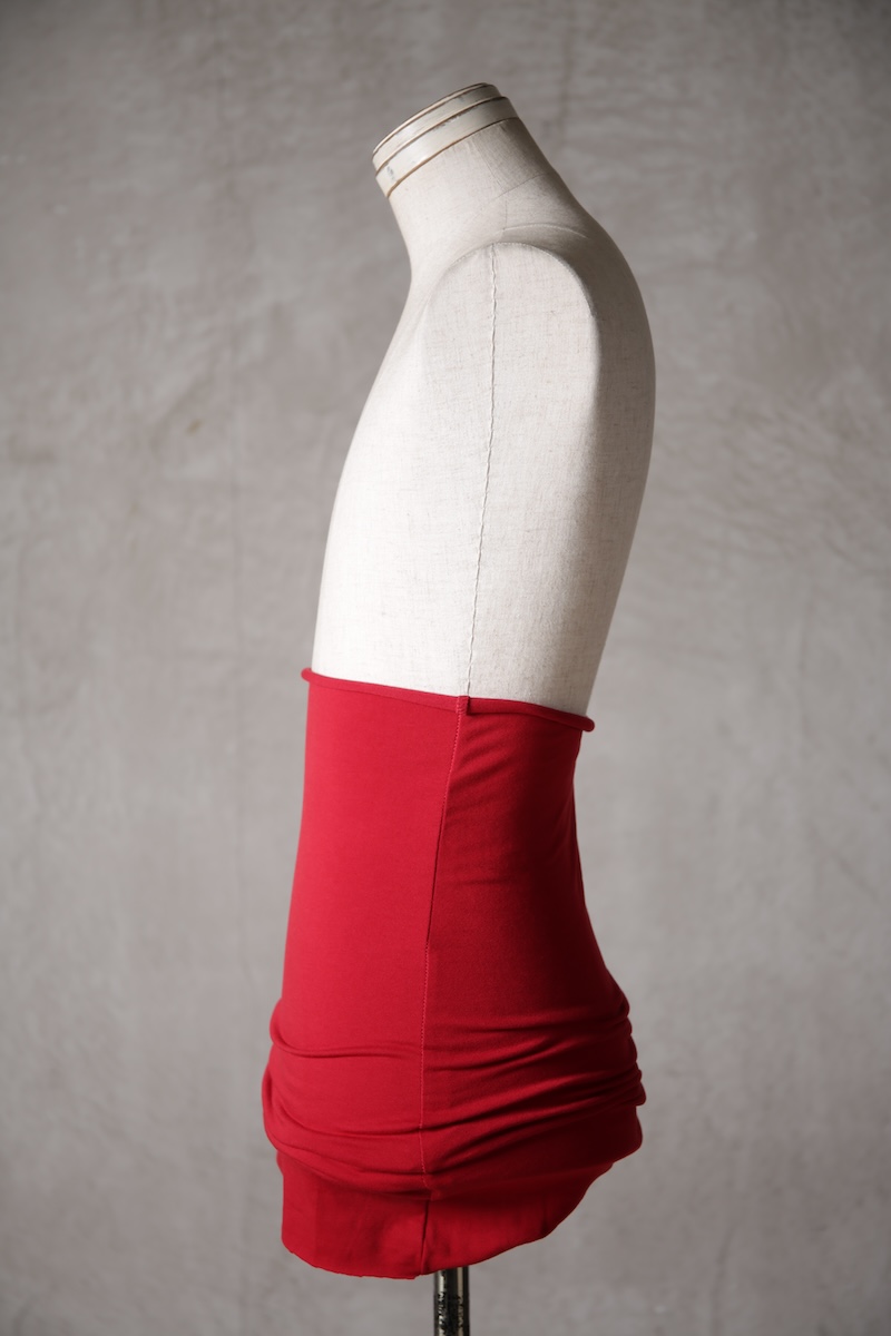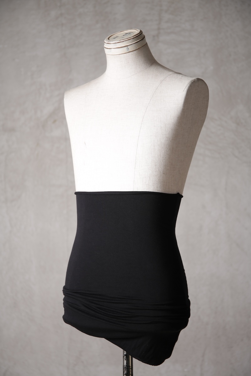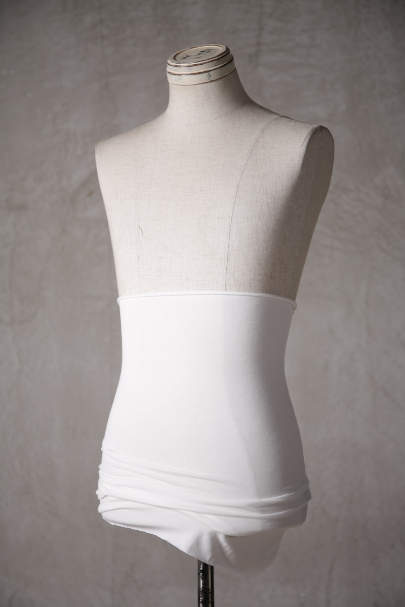 ある種の驚愕アイテムで実際的な防寒性という機能と共に「機能美」を兼ね備えた腹巻アイテム。このブランドのアイコン的なスタイルとも言えるカラーレイヤードのカットソーの組合せの最小公約数で実現出来るアイテムとなっている。通常であればタンクトップや袖付きのカットソーとの組合せでのレイヤードをこの腹巻と重ね合わせることで裾からお好きなカラーリングを見せることで魅せるスタイルへと昇華させる。