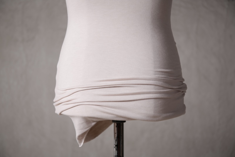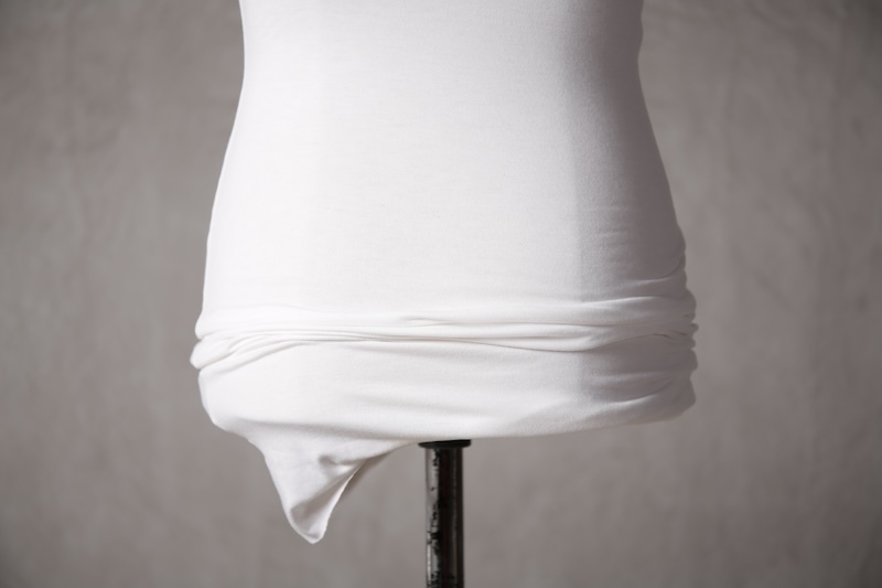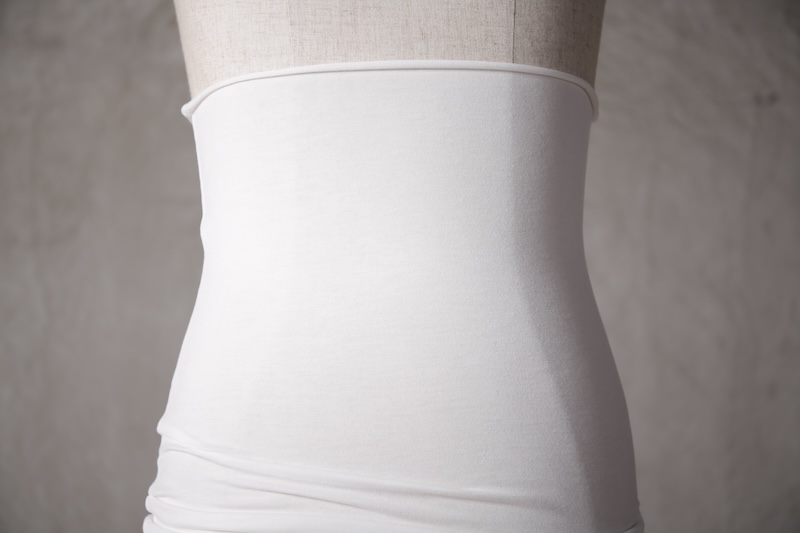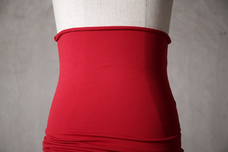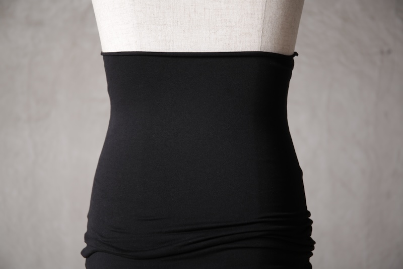 伸縮性を持たせた生地でのみ実現可能なスタイルとなっている。