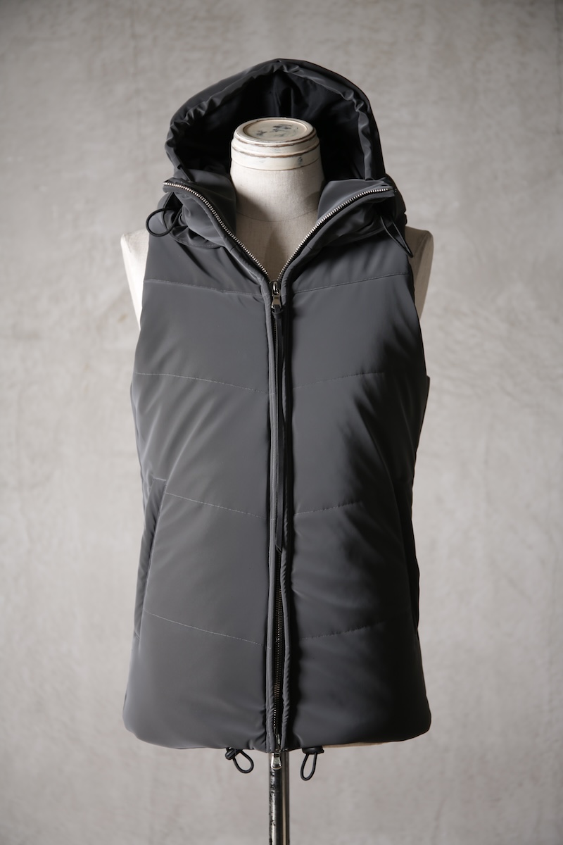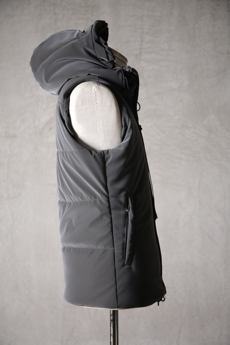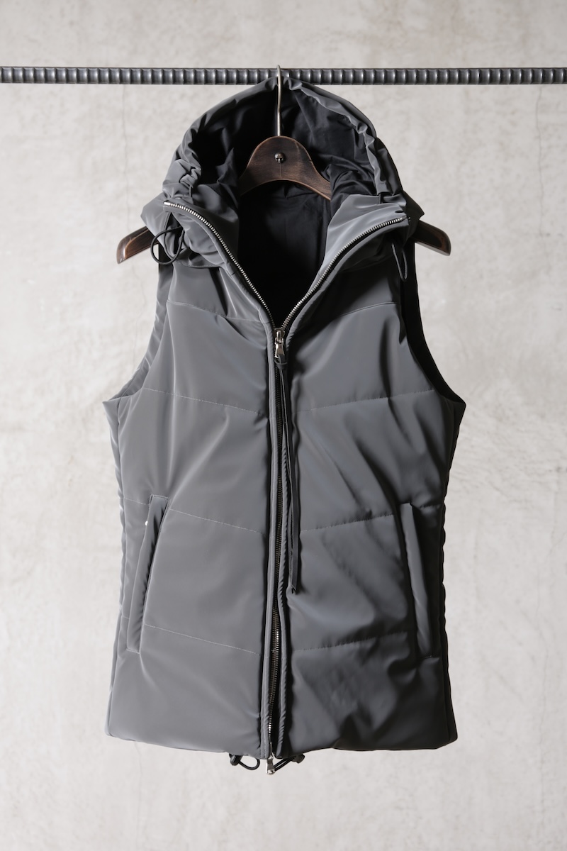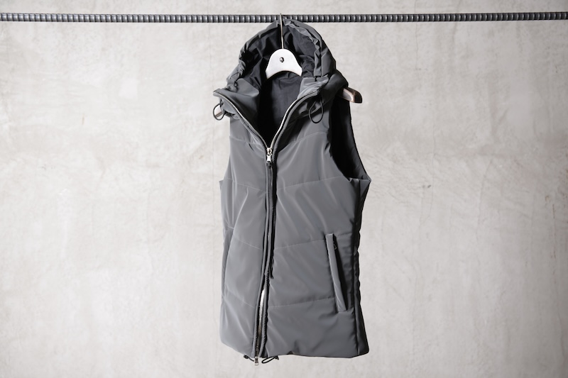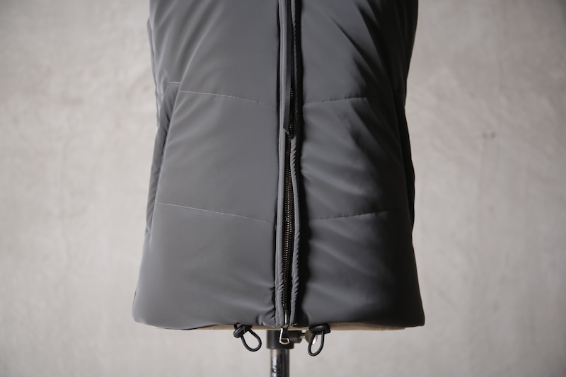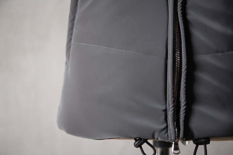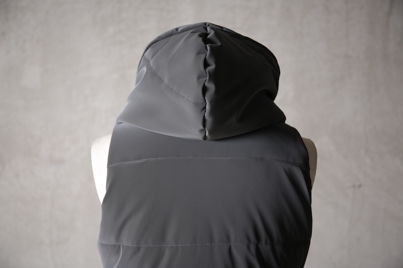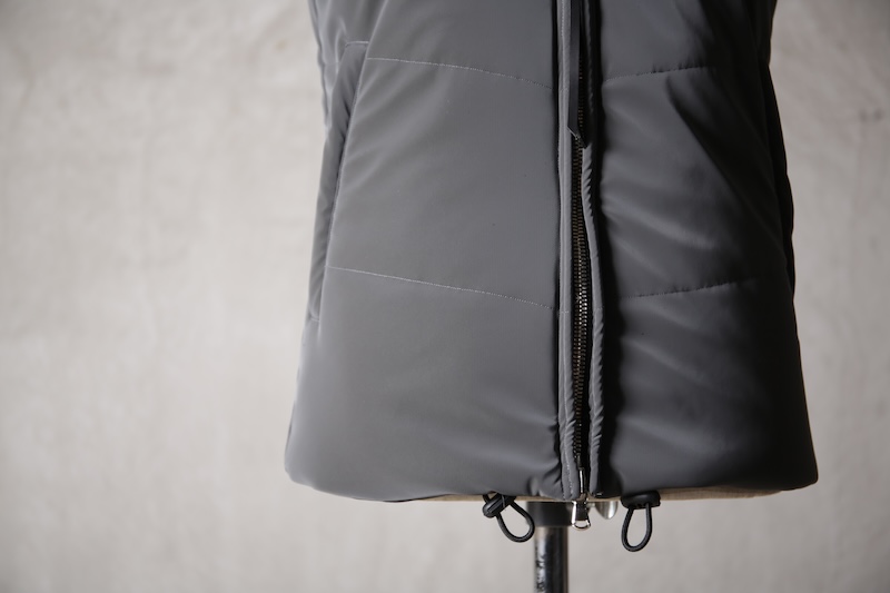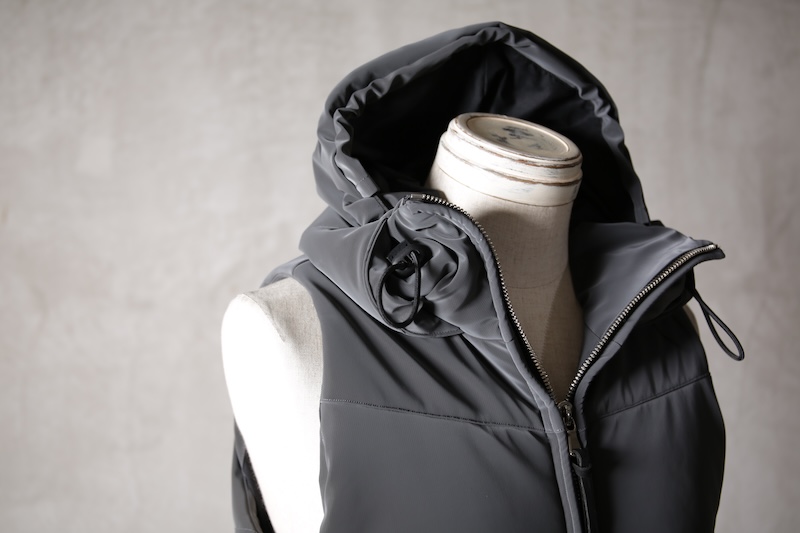 機能美の原点にあるのはミリタリー(軍モノ)要素、そしてスポーツ(運動)機能である。なぜならば単純にこの2点が追い求める要素には運動可動域と共に実際的な着用時においての命に直結する要素が含まれておりその向上によってより快適な着用衣として深化しているからだ。翻ってこの1100モデルはそういった要素を自分なりの解釈で考察を加えディティールの中に織り交ぜながら構築したモデルとなる。単純な中綿入りベストの枠を越え特にフーディ周りの構造はドローコードの配置とコードの収納構造など見えない部分に大きな力を割いた。裾にもコードを配置することで着用時のバランスを整えることに寄与している。身頃部分はほぼ最重量となる200gの中綿を配し、ポケット口やフード部分は全体のフォルムを意識して中綿の分量を変えるなどしている。フロントジップ部分はミリタリー要素からのジップを隠す手法でタコ紐(補強)を配置した構造でこれによりジップアイテムとのレイヤードもしやすい。内側には両胸部分裏地との切り返し部分にスリット型のポケットも配置しているので日常的な小物の使い勝手を向上させている。レザーを始めとするウェアアイテム、ジャンプスーツなどと相性の良い秋冬の最高アウターとして位置する。