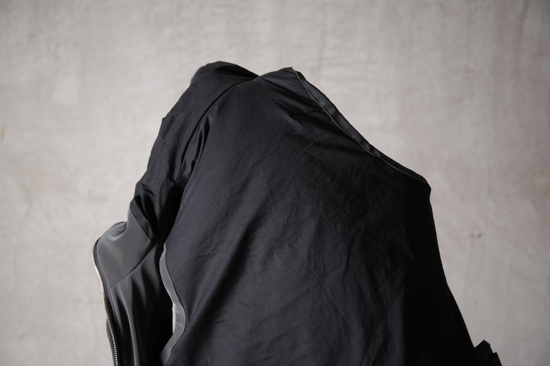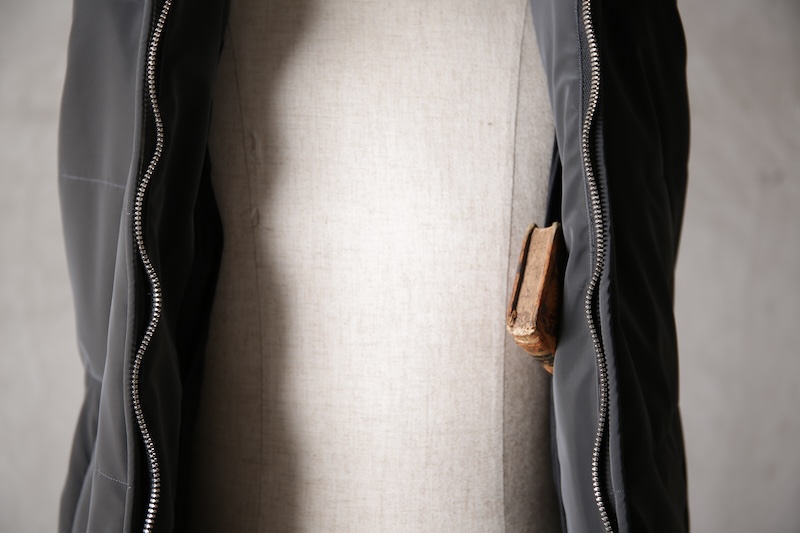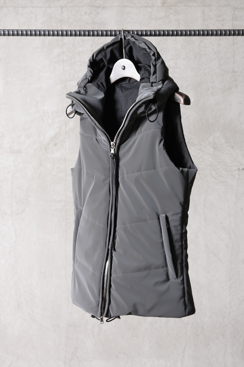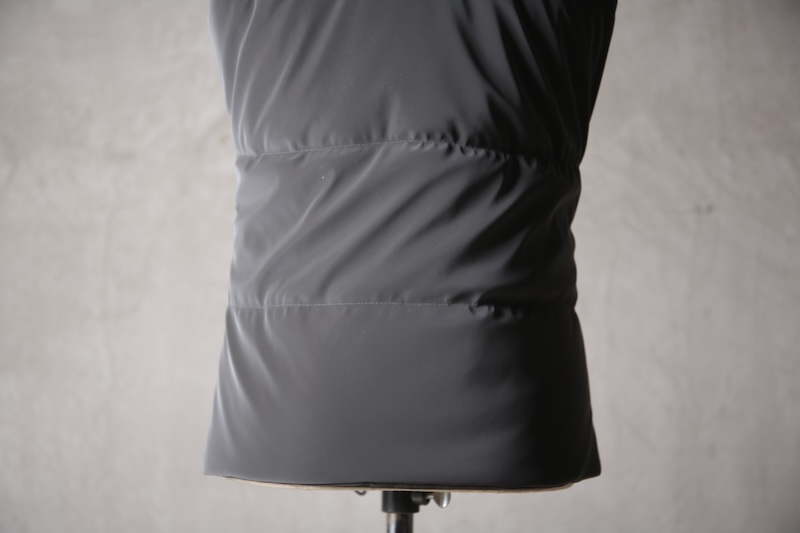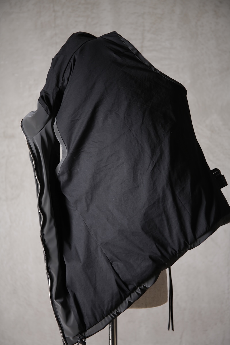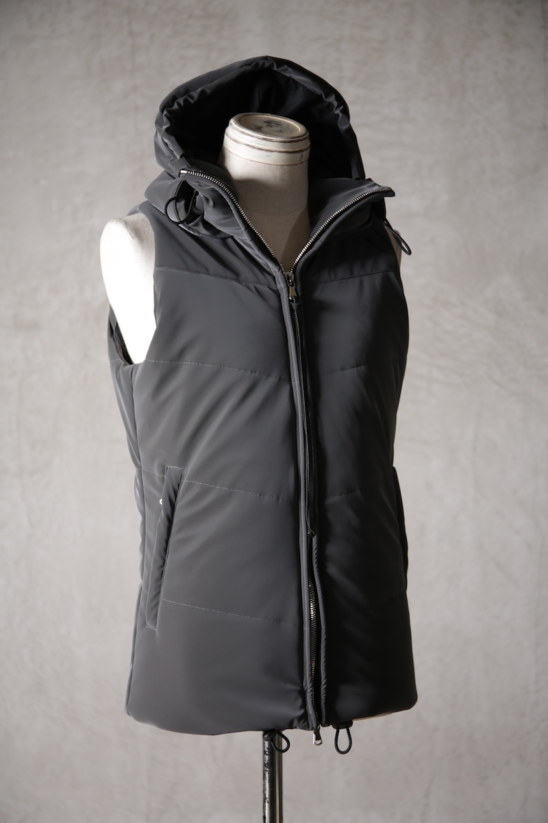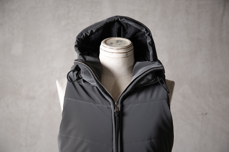 機能美の原点にあるのはミリタリー(軍モノ)要素、そしてスポーツ(運動)機能である。なぜならば単純にこの2点が追い求める要素には運動可動域と共に実際的な着用時においての命に直結する要素が含まれておりその向上によってより快適な着用衣として深化しているからだ。翻ってこの1100モデルはそういった要素を自分なりの解釈で考察を加えディティールの中に織り交ぜながら構築したモデルとなる。単純な中綿入りベストの枠を越え特にフーディ周りの構造はドローコードの配置とコードの収納構造など見えない部分に大きな力を割いた。裾にもコードを配置することで着用時のバランスを整えることに寄与している。身頃部分はほぼ最重量となる200gの中綿を配し、ポケット口やフード部分は全体のフォルムを意識して中綿の分量を変えるなどしている。フロントジップ部分はミリタリー要素からのジップを隠す手法でタコ紐(補強)を配置した構造でこれによりジップアイテムとのレイヤードもしやすい。内側には両胸部分裏地との切り返し部分にスリット型のポケットも配置しているので日常的な小物の使い勝手を向上させている。レザーを始めとするウェアアイテム、ジャンプスーツなどと相性の良い秋冬の最高アウターとして位置する。