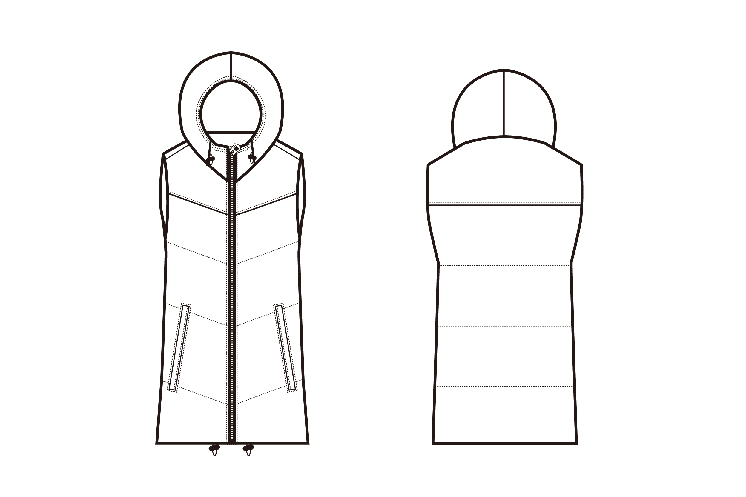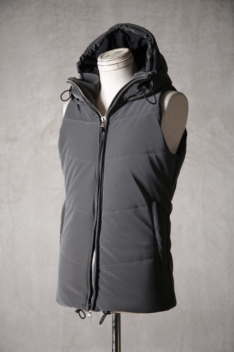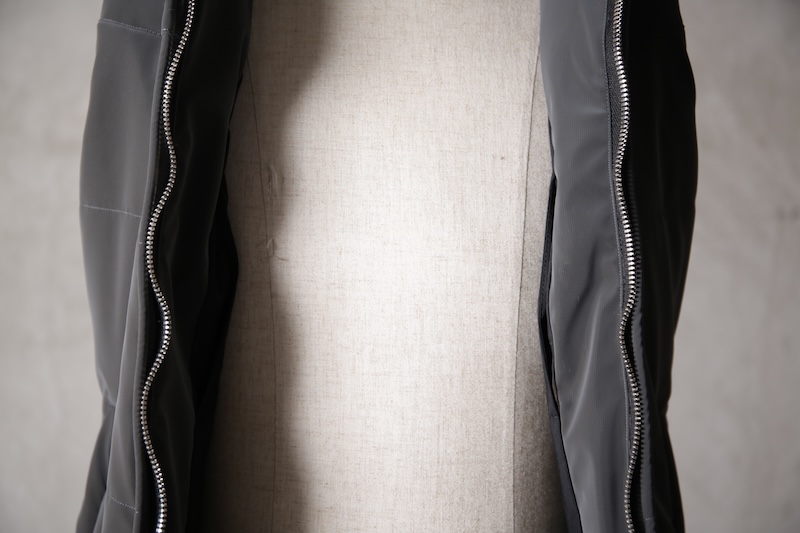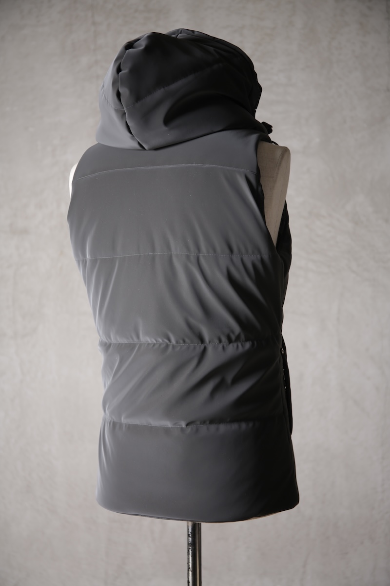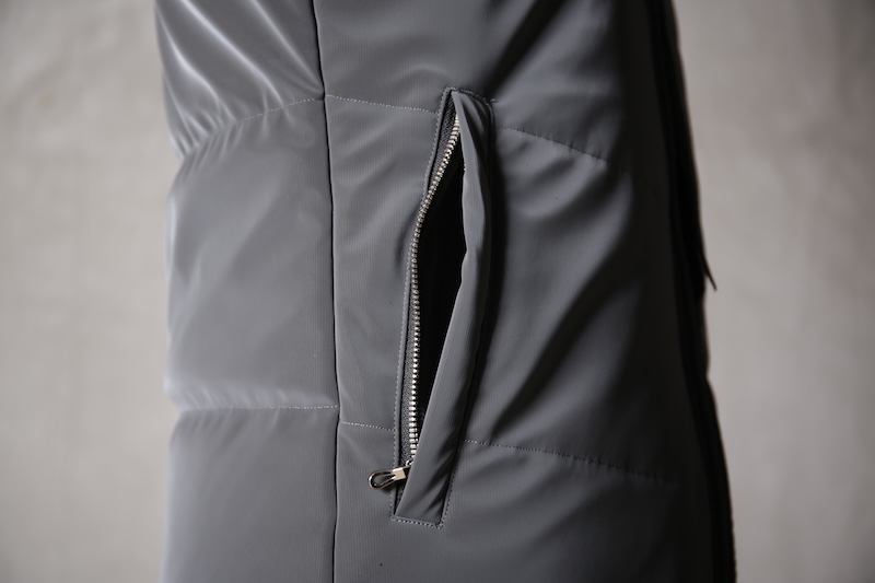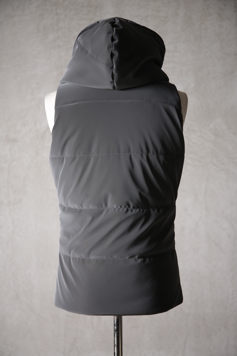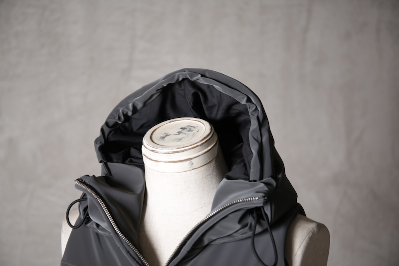 機能美の原点にあるのはミリタリー(軍モノ)要素、そしてスポーツ(運動)機能である。なぜならば単純にこの2点が追い求める要素には運動可動域と共に実際的な着用時においての命に直結する要素が含まれておりその向上によってより快適な着用衣として深化しているからだ。翻ってこの1100モデルはそういった要素を自分なりの解釈で考察を加えディティールの中に織り交ぜながら構築したモデルとなる。単純な中綿入りベストの枠を越え特にフーディ周りの構造はドローコードの配置とコードの収納構造など見えない部分に大きな力を割いた。裾にもコードを配置することで着用時のバランスを整えることに寄与している。身頃部分はほぼ最重量となる200gの中綿を配し、ポケット口やフード部分は全体のフォルムを意識して中綿の分量を変えるなどしている。フロントジップ部分はミリタリー要素からのジップを隠す手法でタコ紐(補強)を配置した構造でこれによりジップアイテムとのレイヤードもしやすい。内側には両胸部分裏地との切り返し部分にスリット型のポケットも配置しているので日常的な小物の使い勝手を向上させている。レザーを始めとするウェアアイテム、ジャンプスーツなどと相性の良い秋冬の最高アウターとして位置する。