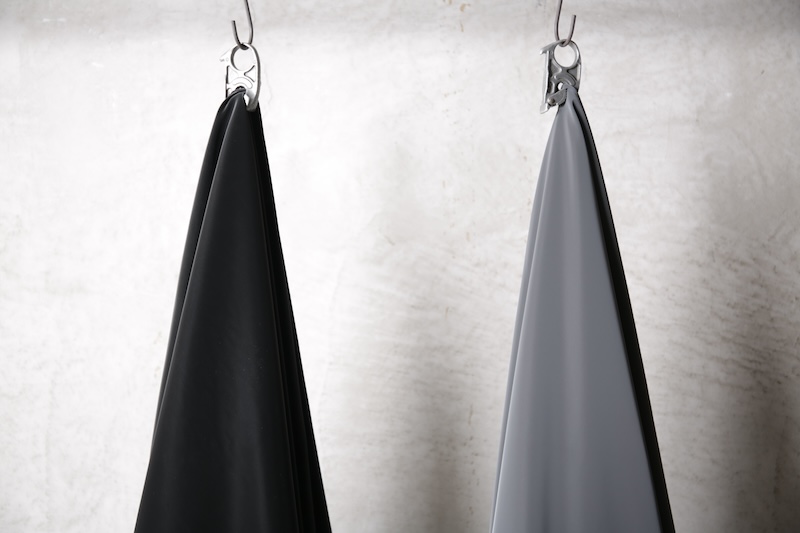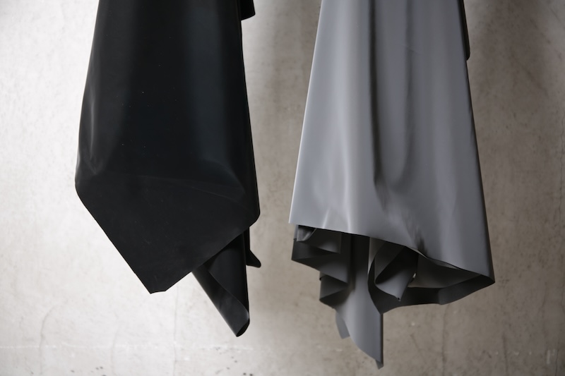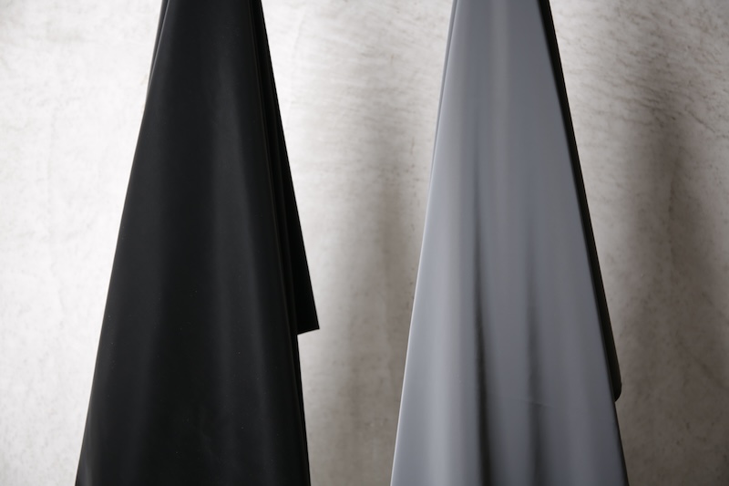 ある意味でのこれは偽りの魅力であり真実的な意味合いを持った素材。Paの基布生地のベース生地自体が横編み構造を持つフライス状となっており、この時点で非常に稀有な素材であるにも関わらずその基布の表面にPuコーティングを施すことでまるでビロードのような美しい表情感を生み出している。また基布がフライス状の構造となっているために中肉の布帛素材ではありえないほどのしなやかに畝るようなストレッチ構造を持っていることで着用の心地良さに加えて、着用者のフォルムを美しく魅せてくれる。上質で上品な質感(まさしくエロクール)はちょっと簡単には出逢えない素材であると断言出来る。